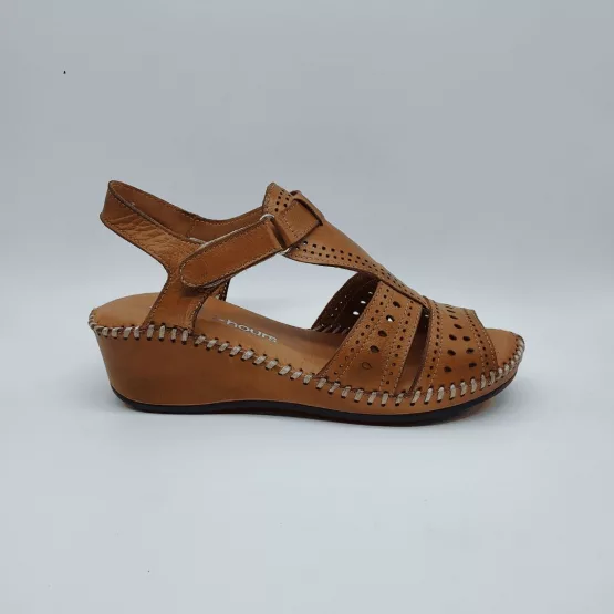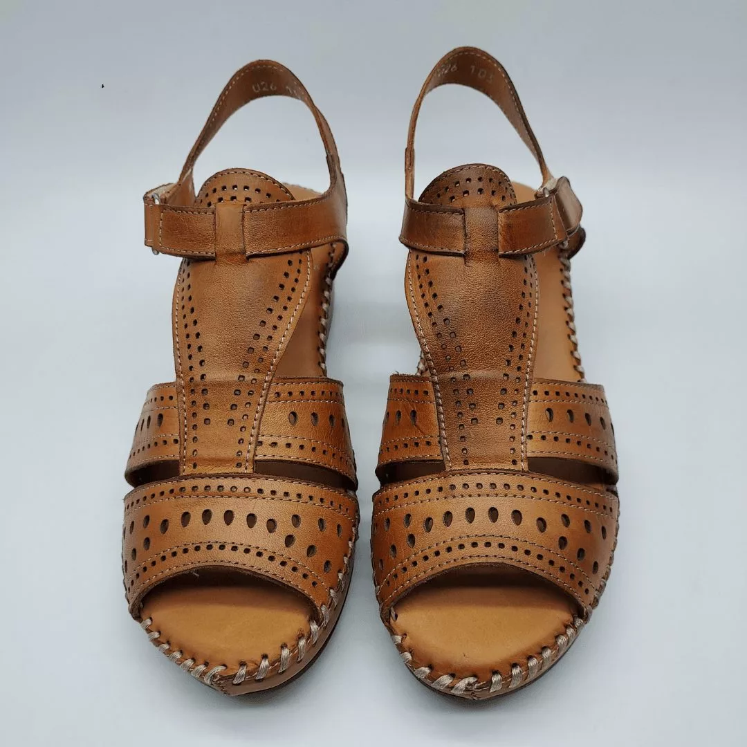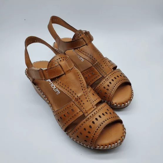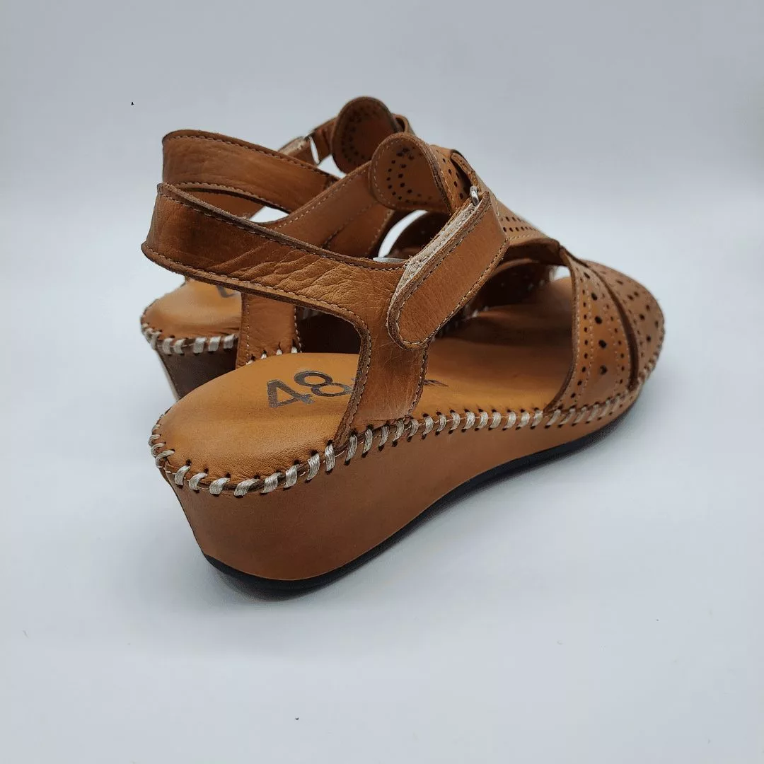 48+Hours Mod. 514003/11, Sandalia de Tiras en Piel Calada acabado color Cuero, cuña de 4,5 cm de altura y plataforma de 1 cm, con Plantilla acolchada de piel, cierre mediante Velcro regulable.
