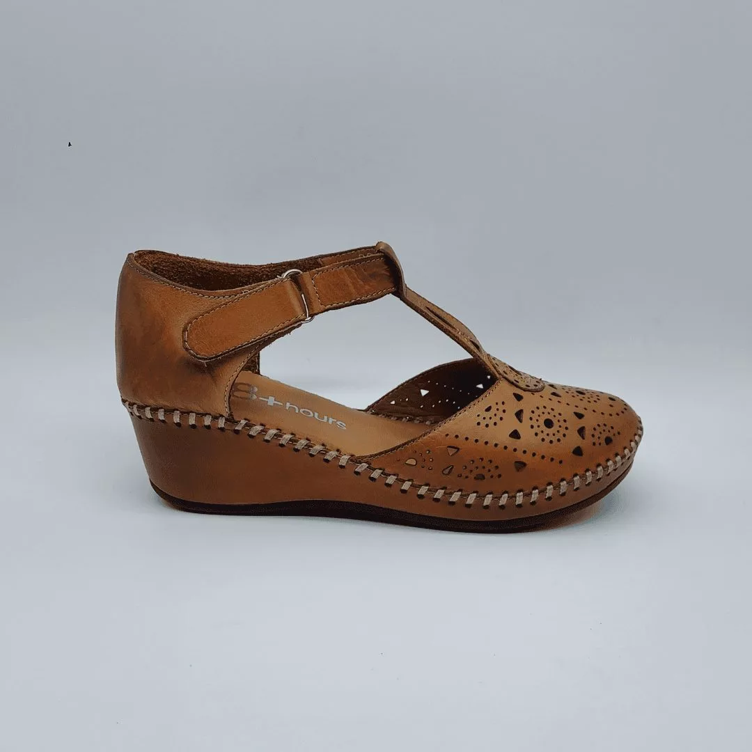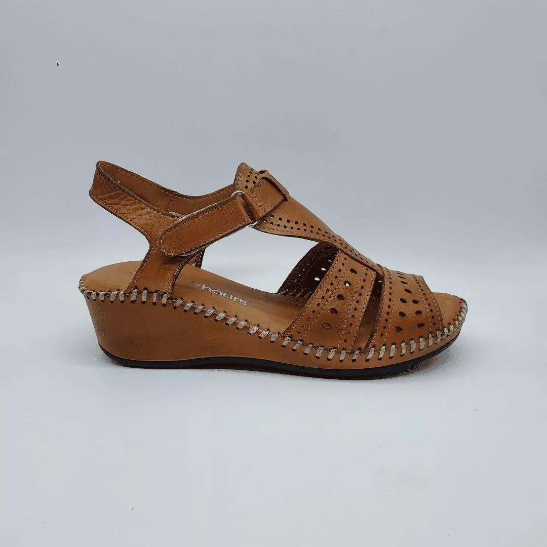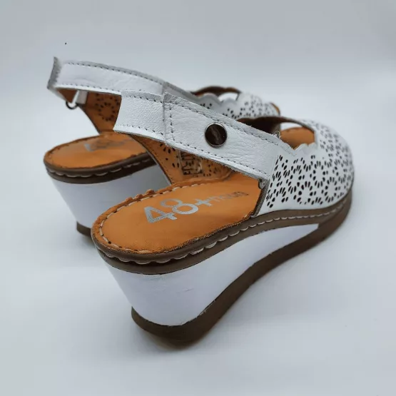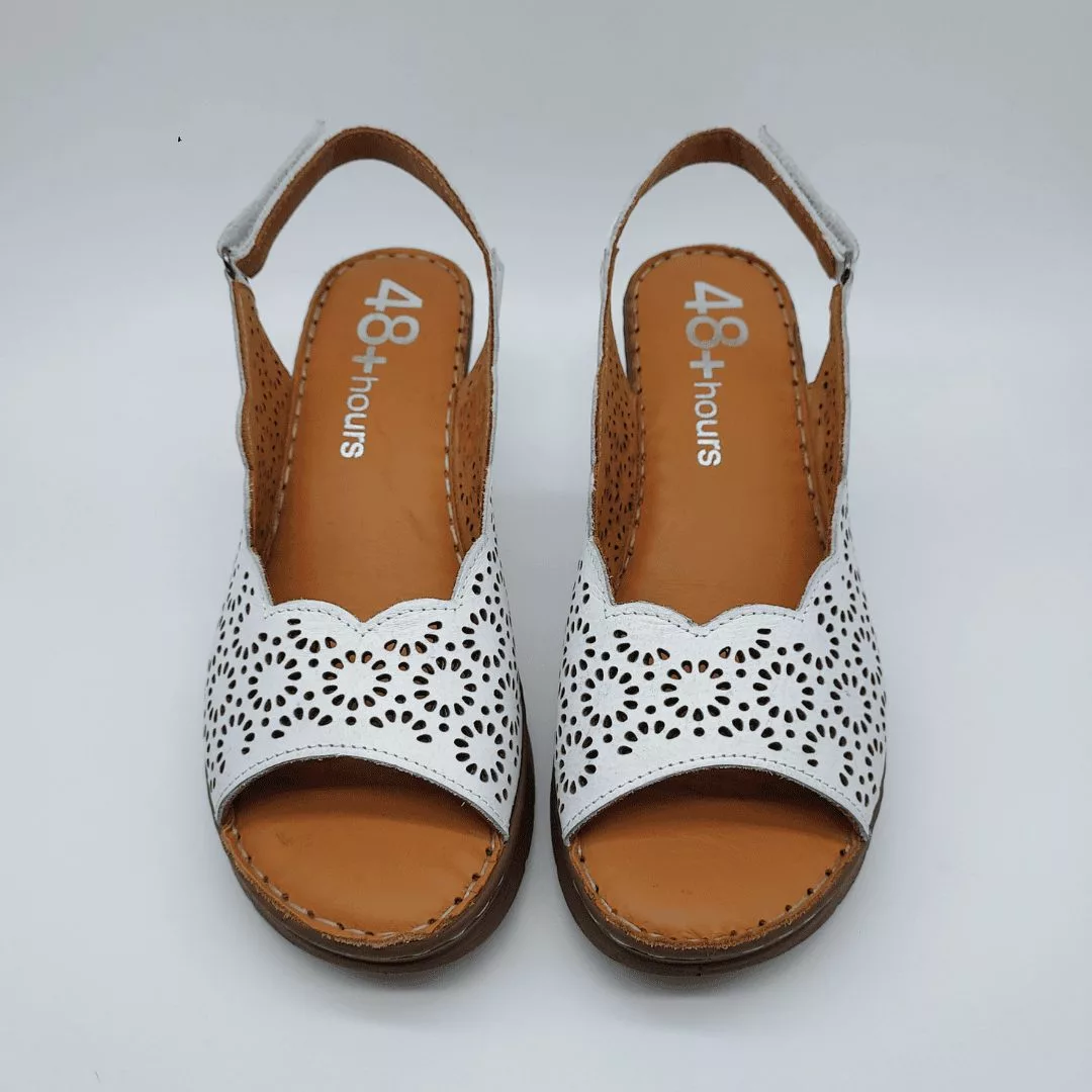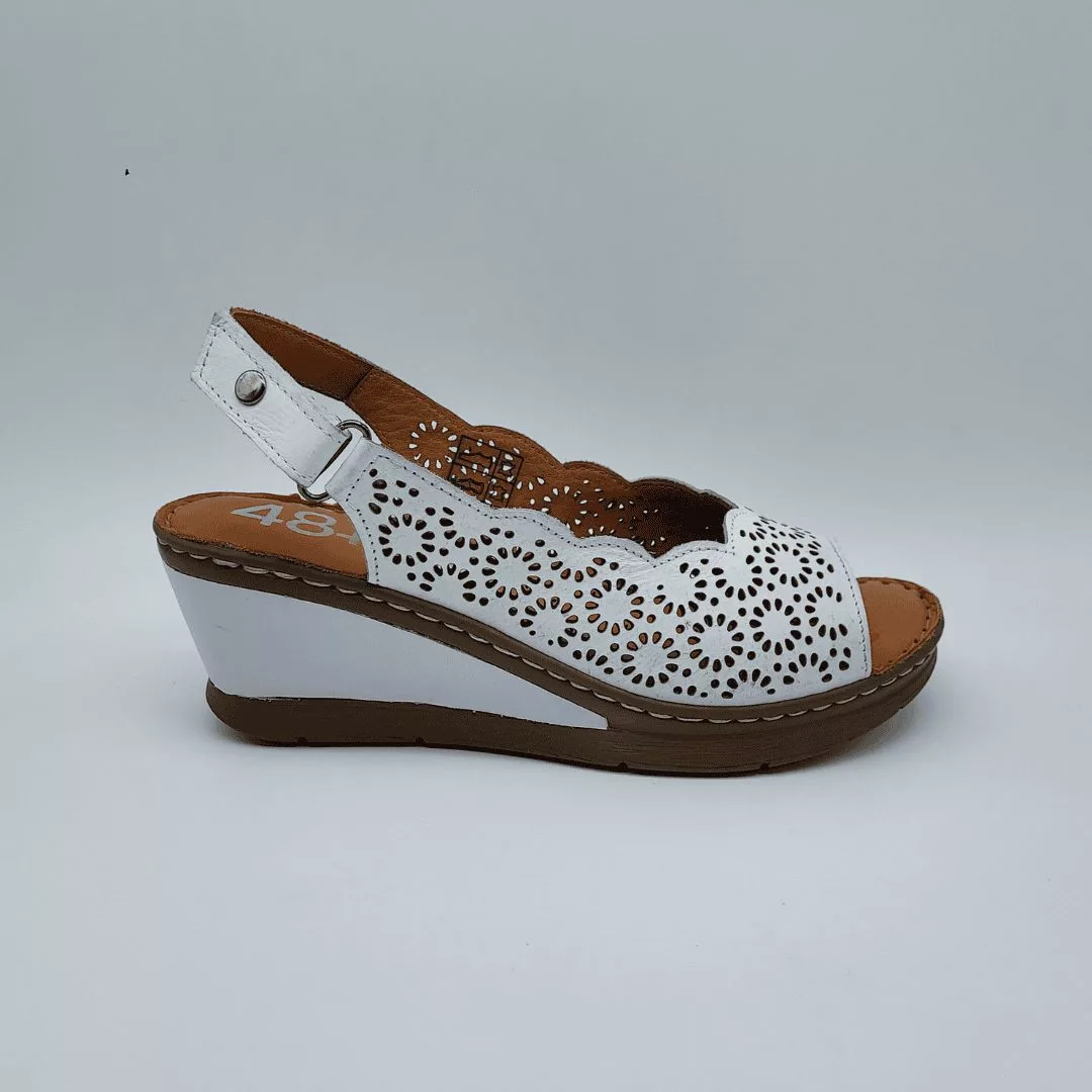 48+Hours Mod. 515407/30, Sandalia en Piel troquelada en forma de girasol acabado color Blanco, cuña en dos colores de 5,5 cm de altura y plataforma de 1 cm, con Plantilla acolchada de piel, cierre mediante Velcro regulable.