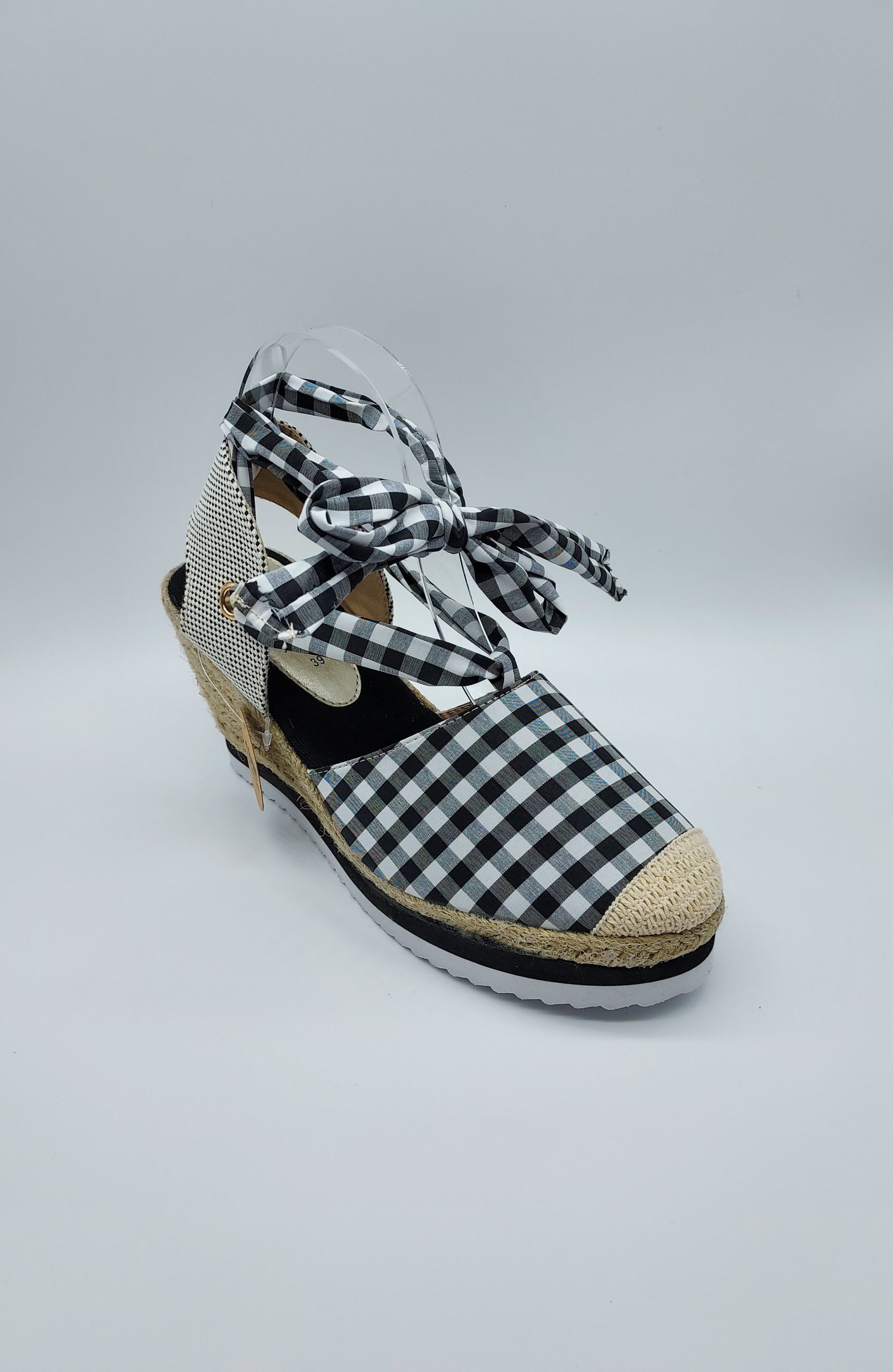 B&W Mod. VICHY MV2 31807, Sandalia tipo Alpargarta con Cuña, Acabado Vichy Negro, Puntera Cerrada, con Suelo de Goma, Cuña de Yute, Altura de Cuña 10 cms., Altura de Plataforma 2,7 cms., sujeccion mediante cintas que unen desde la lona la zona trasera que se anuda en el tobillo mediante lazada.