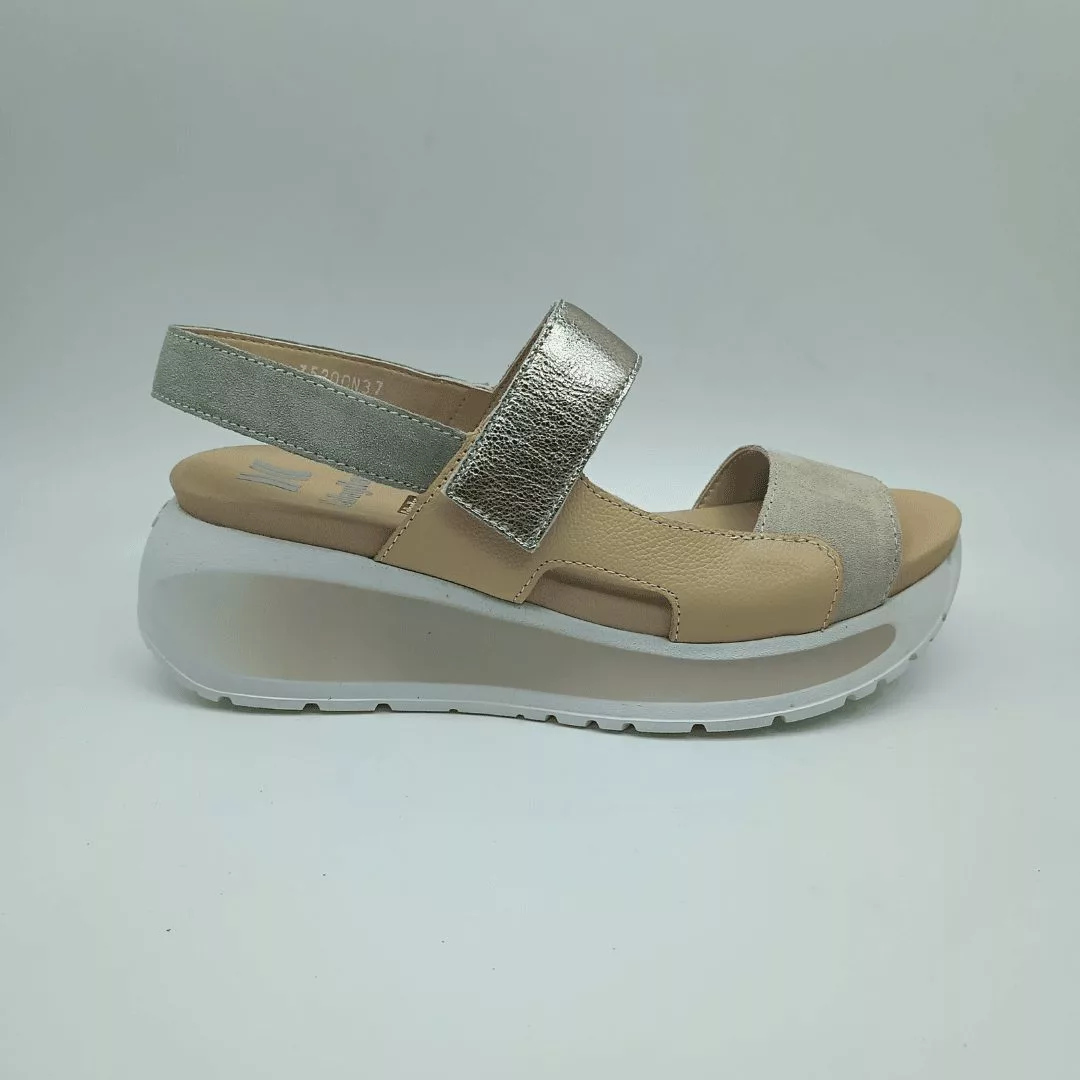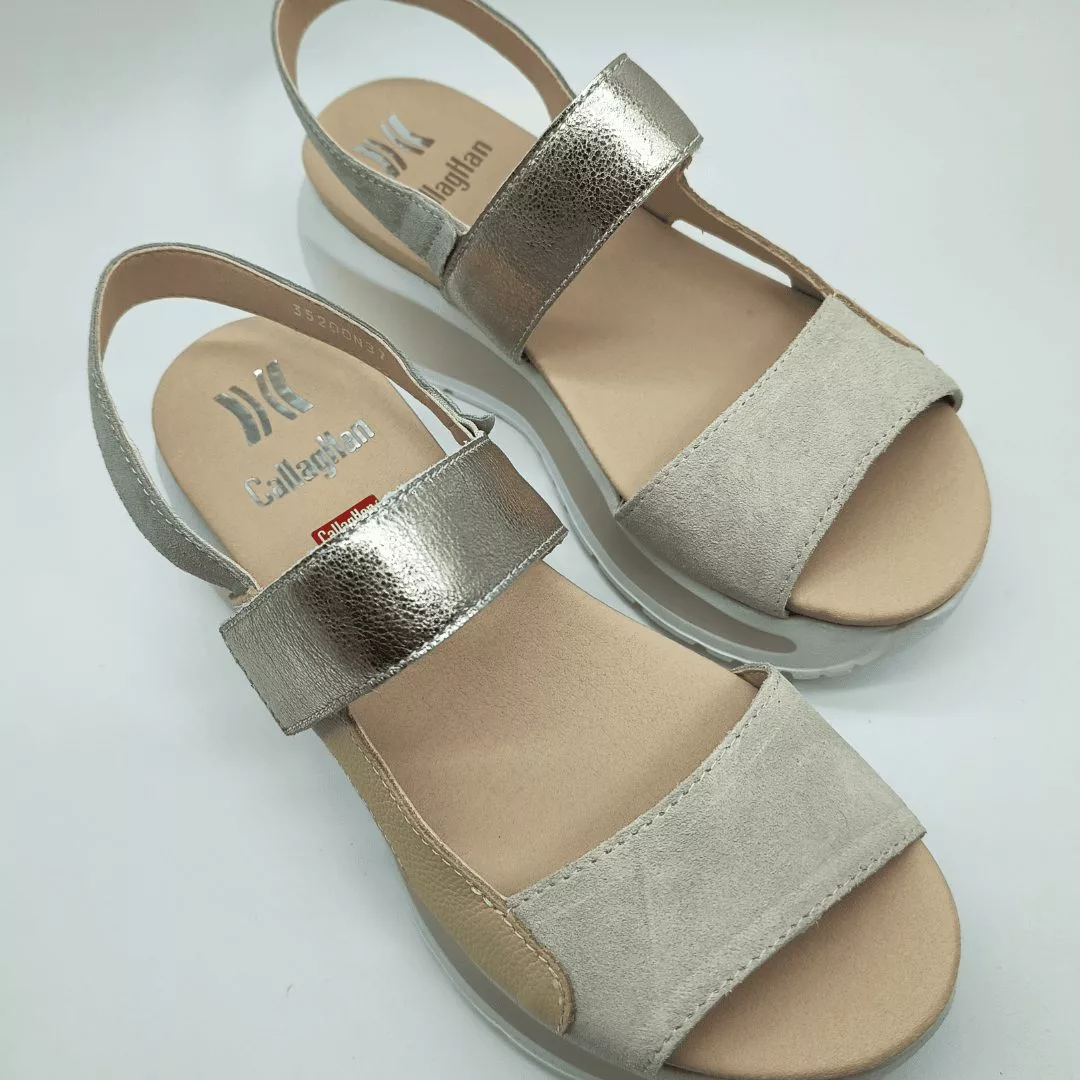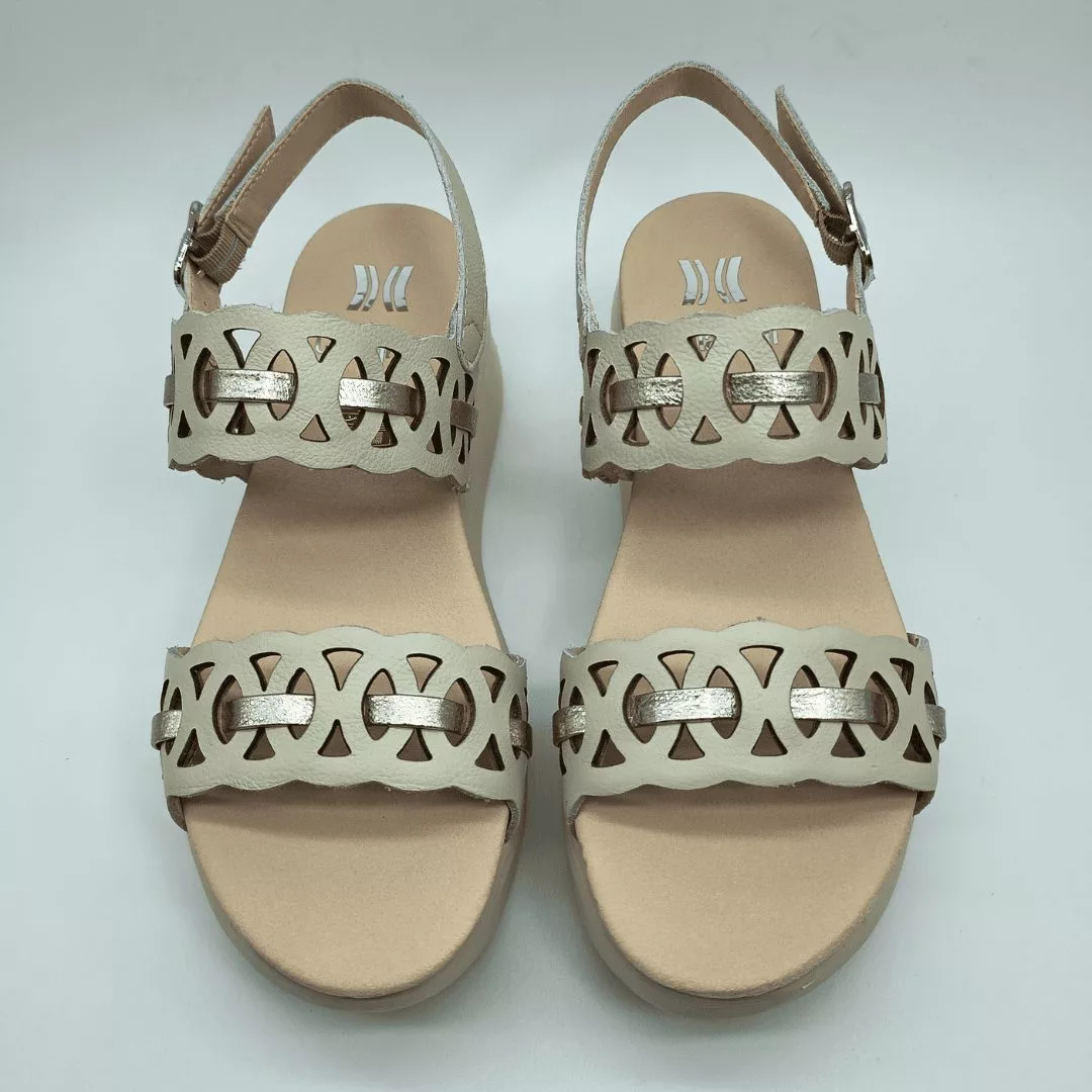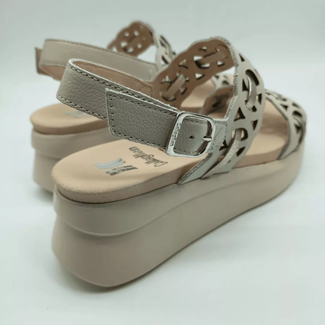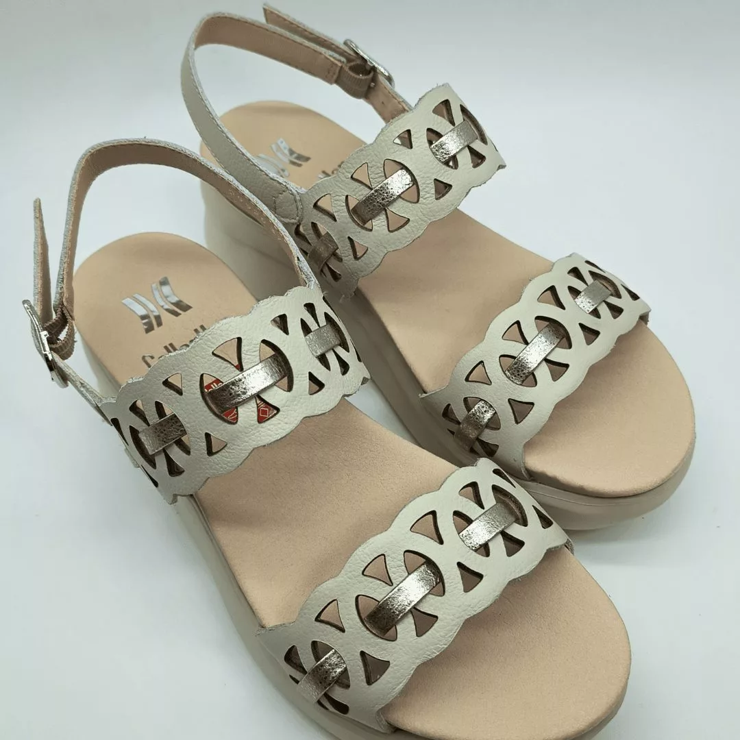 Callaghan Mod. 29926, Sandalia en Piel Troquelada y Entrelazada de Alta Calidad acabado Floty Off/Oro, Altura Cuña 5 cm. de altura y Plataforma Delantera de 1,5 cm, Forro en Material Textil Transpirable, Cierre mediante Hebilla, con «Callaghan Adaptaction«.