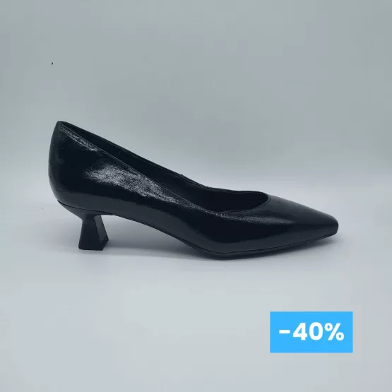 Desireé Mod. Elba 15, Salón fabricado en Piel Acharolada acabado Rock Negro. Plantilla de Gel, Sistema Total Flex anti impactos, Puntera Afilada, Tacón Bajo tipo Chupete con base de 4,5 cm de altura con piso engomado antideslizante. Fabricado en España.