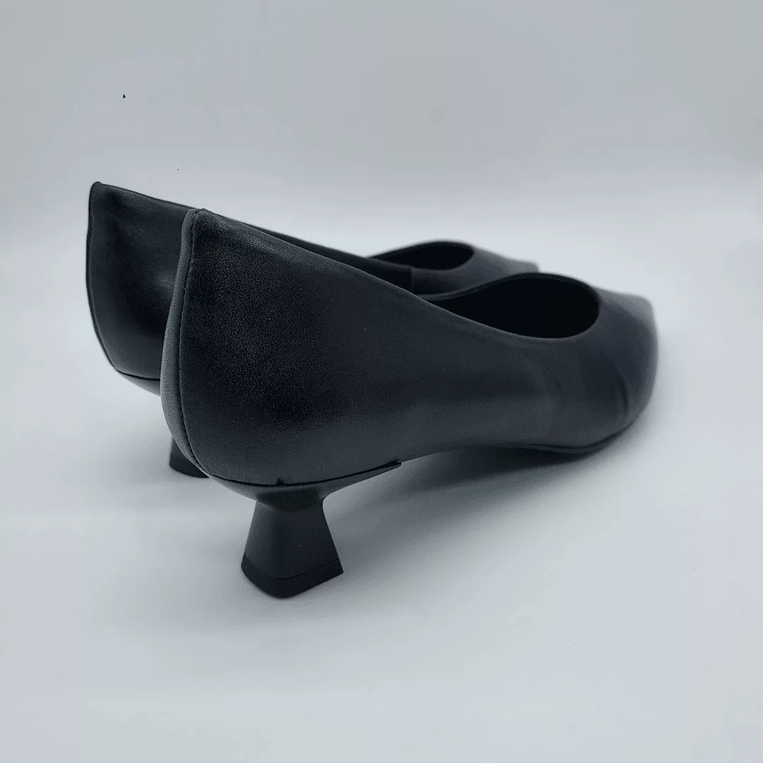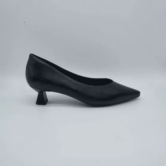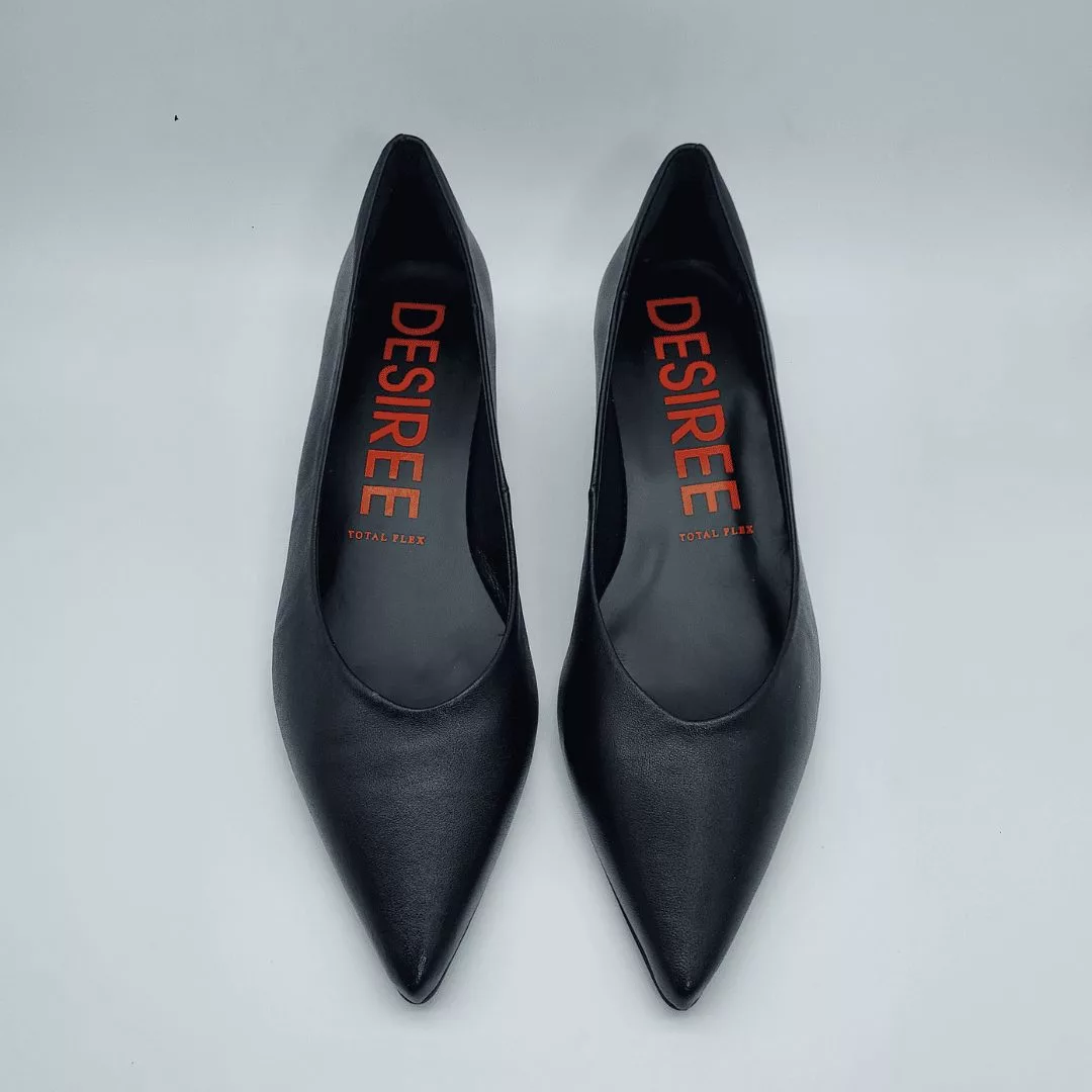 Desireé Mod. Garons 2, Salón en Piel Acabado Verona Negro. Plantilla Acolchada, Sistema Total Flex anti impactos, Puntera Afilada. Tacón Bajo tipo Chupete con base de 3,5 cm de altura con piso engomado antideslizante. Hecho en España.