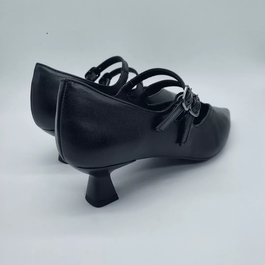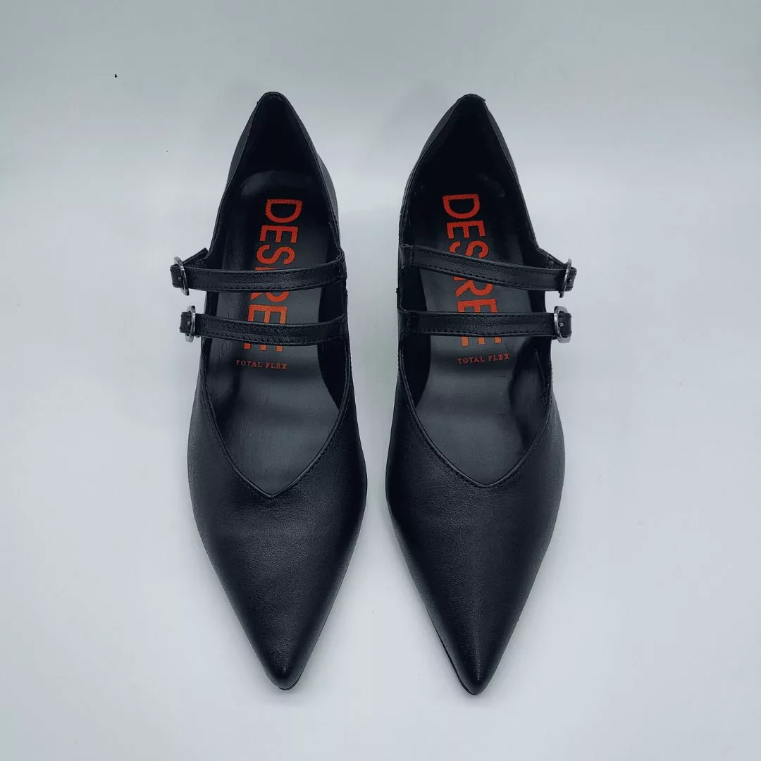 Desireé Mod. Garons 6, Salón en Piel Acabado Verona Negro. Plantilla Acolchada, Sistema Total Flex anti impactos, Puntera Afilada. Cierre mediante Doble Hebilla. Tacón Bajo tipo Chupete con base de 3,5 cm de altura con piso engomado antideslizante. Hecho en España.