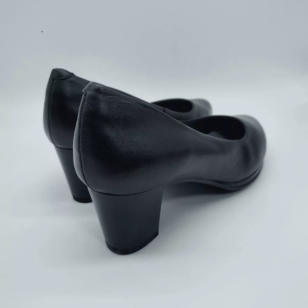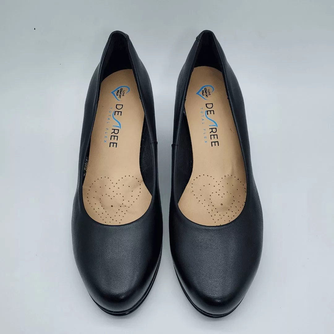 Desireé Mod. Half 1, Salón en Piel Acabado Diana color Negro. Con Sistema Total Flex anti impactos, Tacón Grueso de 5,5 cm. Suela de goma termoplástica, con Plantilla Interior Acolchada. Hecho en España.
