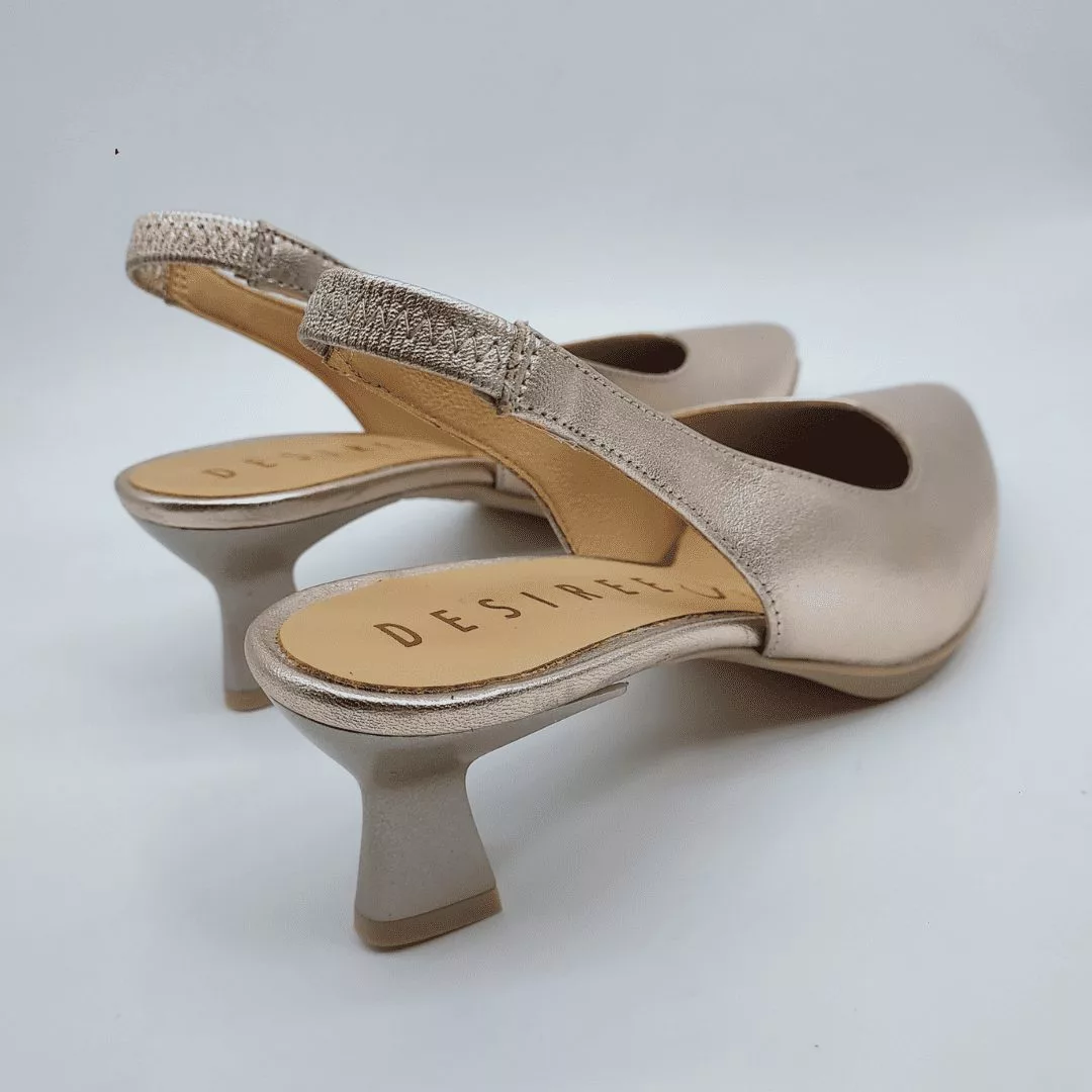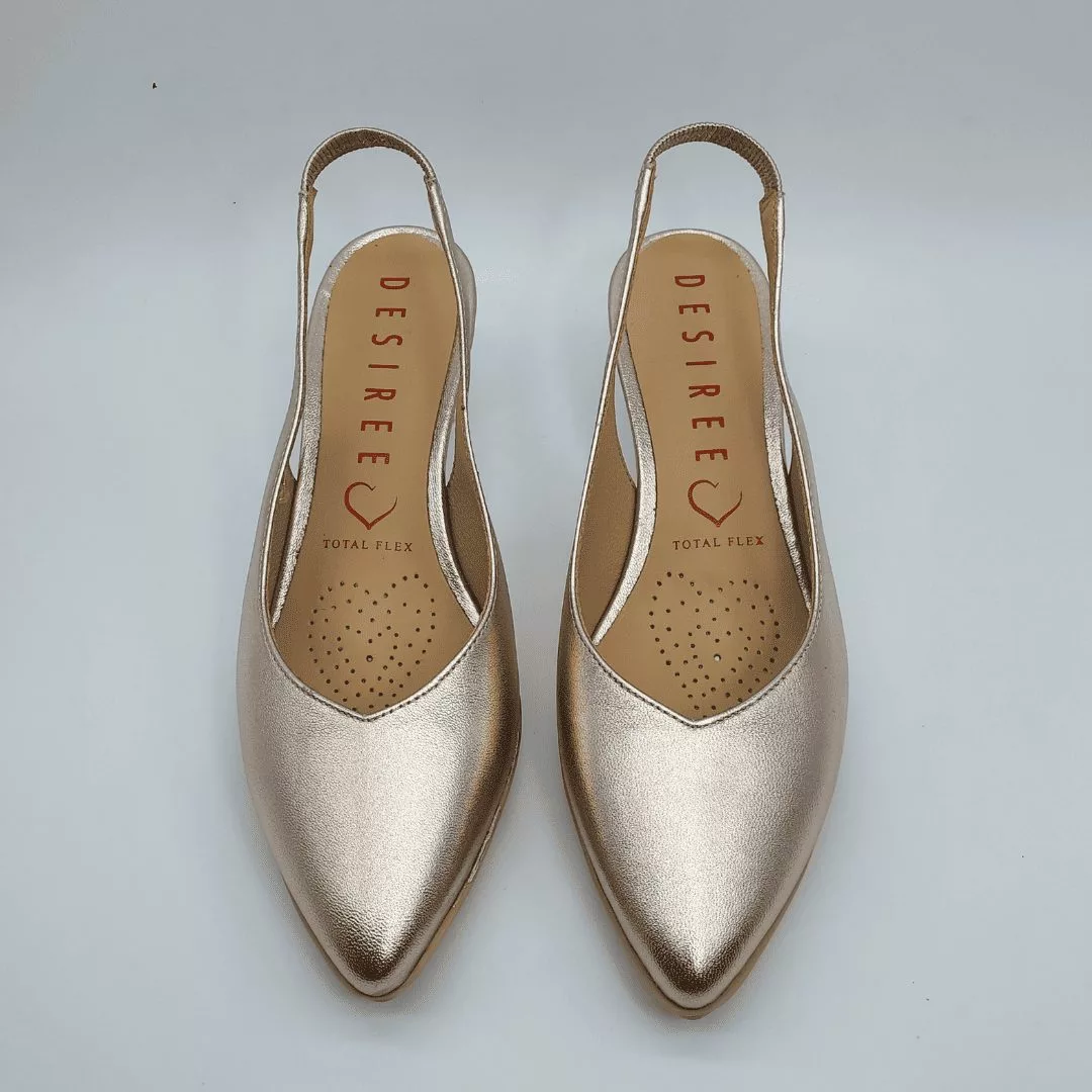 Desireé Mod. MACA 2, Salón Destalonado fabricado en piel Metalizada acabado Star Plata Vieja. Puntera Cerrada. Cierre mediante Tira elástica posterior para un ajuste perfecto, Plantilla de Gel, Sistema Total Flex anti impactos, Tacón Bajo de 4,5 cm. Hecho en España.