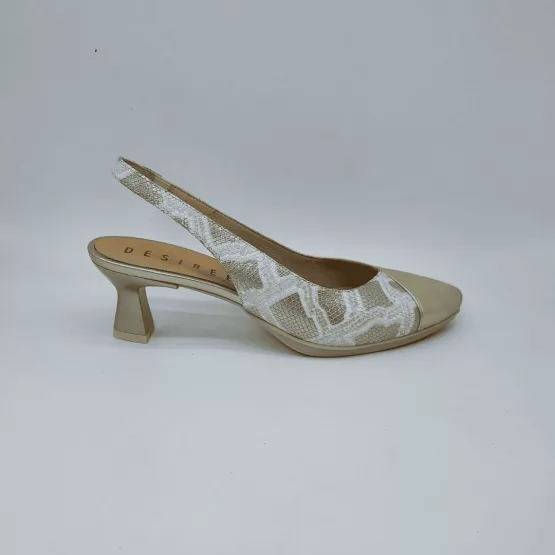 Desireé Mod. MACA 8, Salón Destalonado fabricado en Piel Metalizada acabado color Oro combinada con Piel grabada tipo Coco. Puntera Cerrada. Cierre mediante Tira elástica posterior para un ajuste perfecto, Plantilla de Gel, Sistema Total Flex anti impactos, Tacón Bajo de 4,5 cm. Hecho en España.