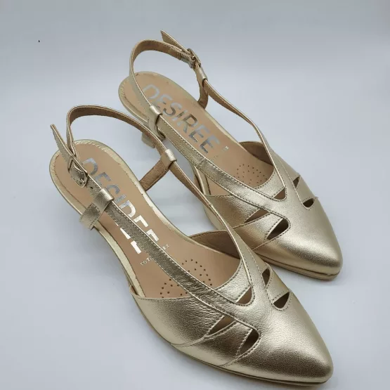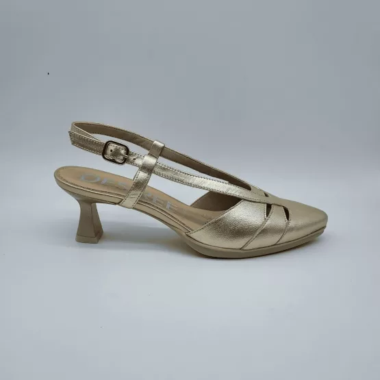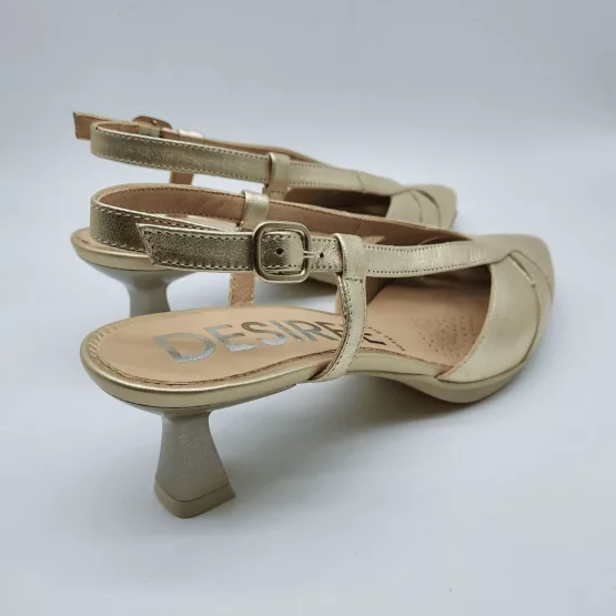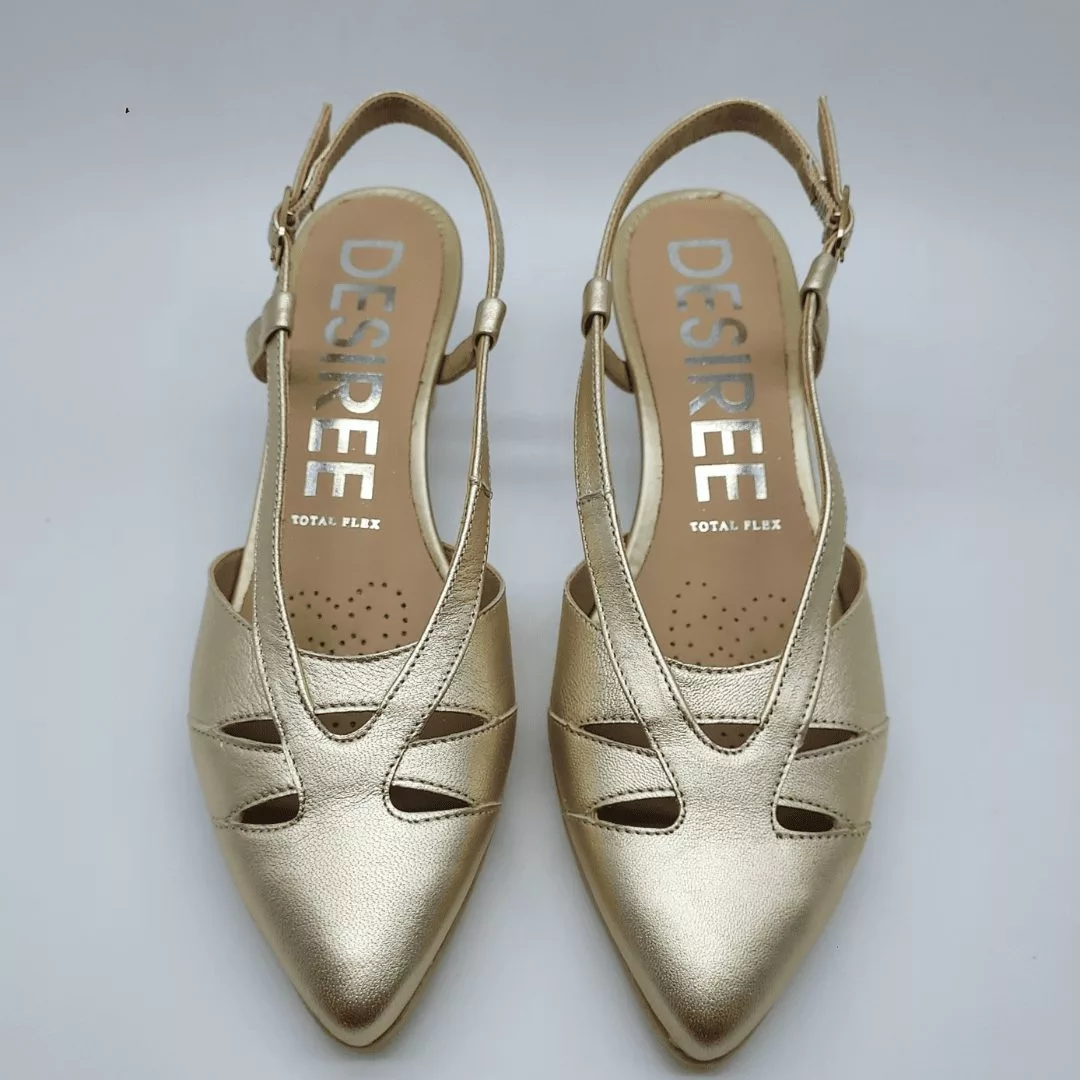 Desireé Mod. MAIA 32, Salón Destalonado fabricado en piel Metalizada acabado Star Platino. Puntera Cerrada. Cierre mediante Hebilla, Plantilla de Gel, Sistema Total Flex anti impactos, Tacón Bajo de 4,5 cm. Hecho en España.