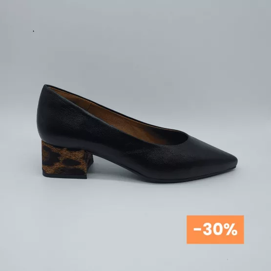 Desireé Mod. Malta 8, Salón en Piel Acabado Venecia Negro. Plantilla Acolchada, Sistema Total Flex anti impactos, Puntera Afilada. Tacón Grueso de 4,5 cm de altura forrado en Animal Print con piso engomado antideslizante. Fabricado en España.