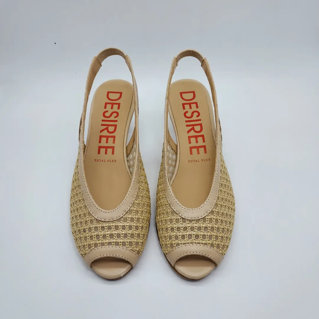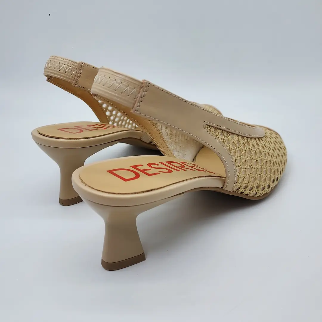 Desireé Mod. PEPA 2, Salón Destalonado fabricado en Piel acabado Combinado Ecru. Con Apertura en Puntera (estilo Peep-Toe). Cierre mediante Tira elástica posterior para un ajuste perfecto, Plantilla de Gel, Sistema Total Flex anti impactos, Tacón de 5,5 cm. Hecho en España.