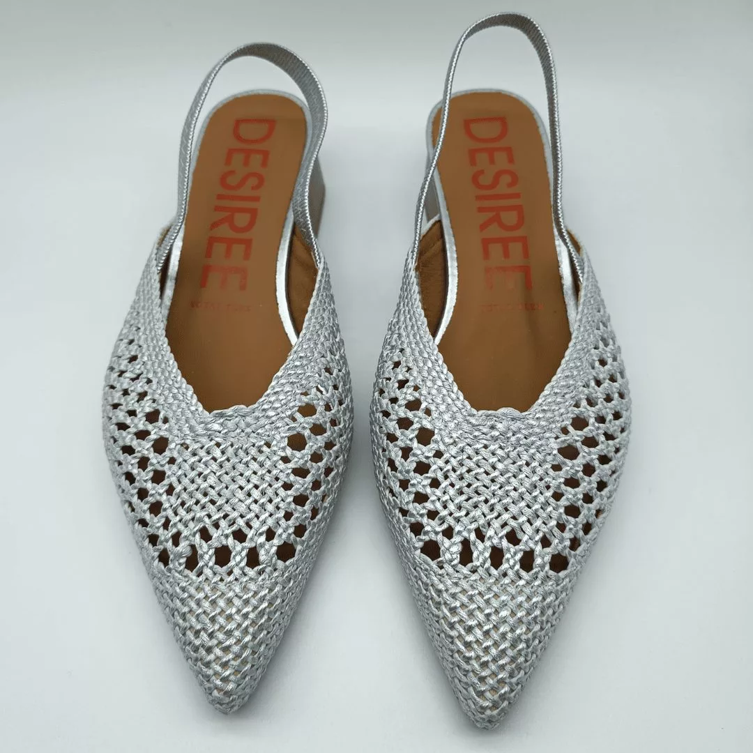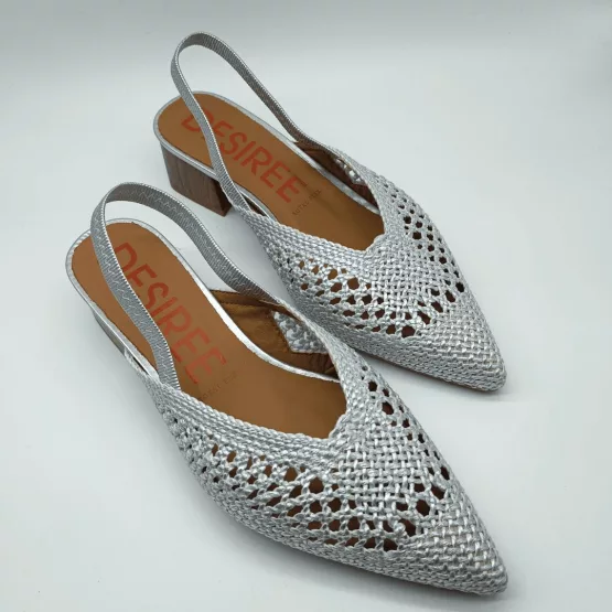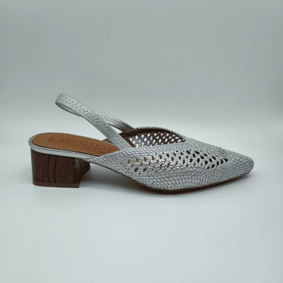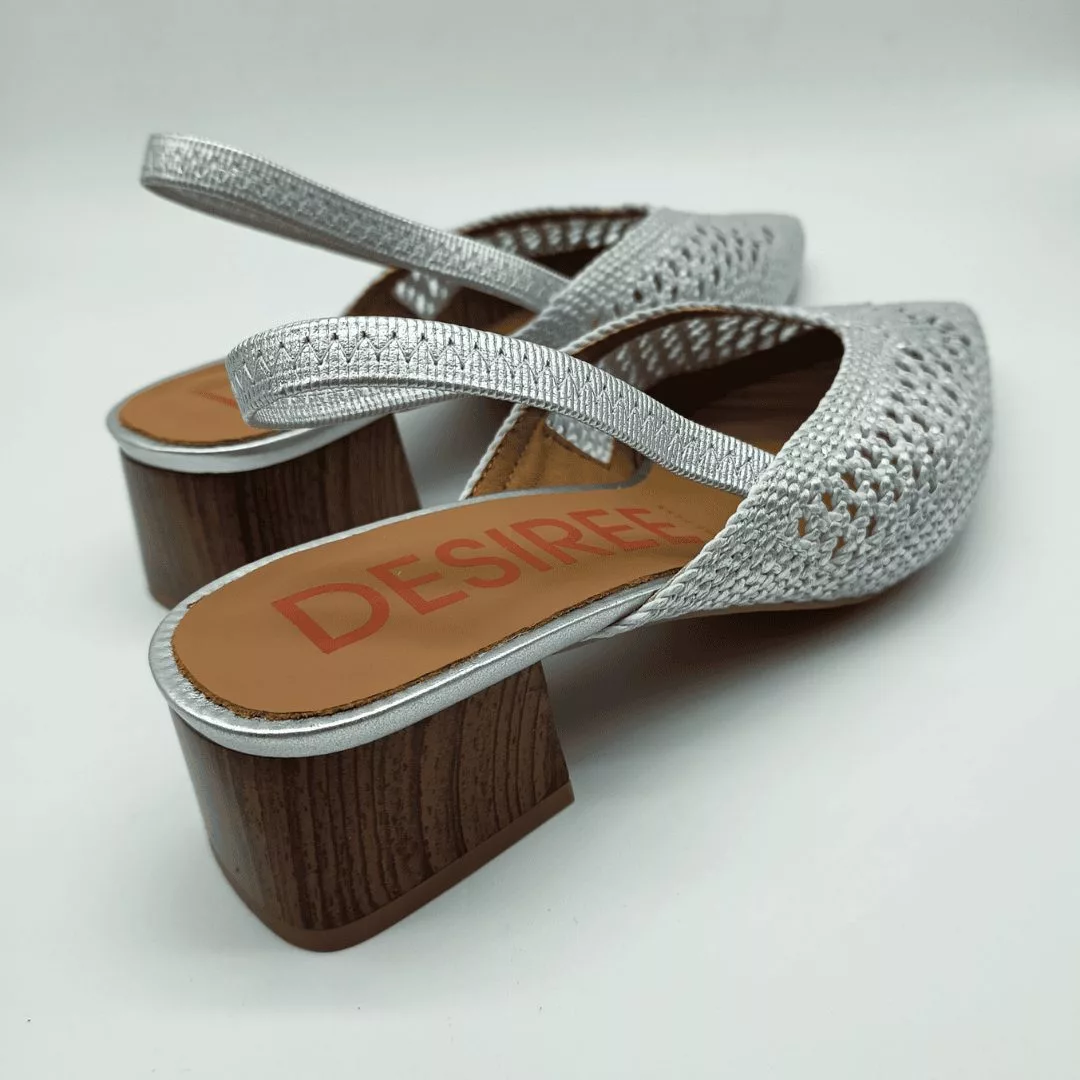 Desireé Mod. Praga 2, Salón Destalonado en Textil Trenzado acabado Plata. Plantilla Acolchada en Piel, Sistema Total Flex anti impactos, Puntera Afilada. Tacón Grueso de 4 cm de altura. Hecho en España.