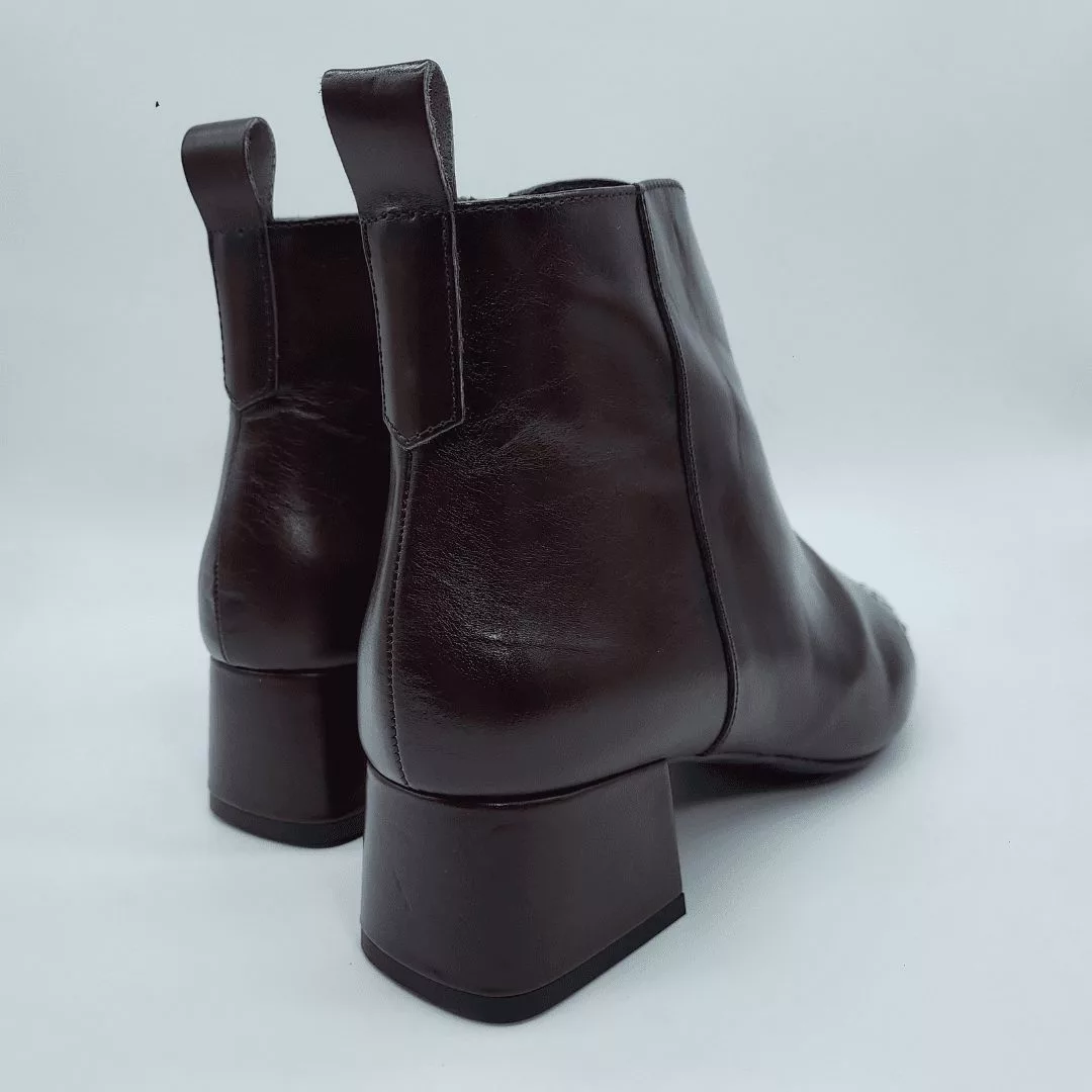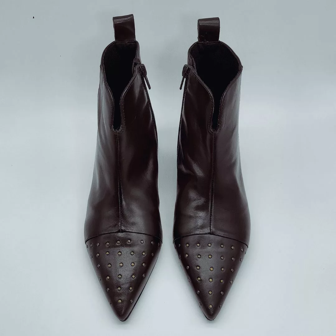 Desireé Mod. Rabat 13, Botín en Piel Acabado Nick Marrón. Plantilla Acolchada, Sistema Total Flex anti impactos, Puntera Afilada con detalles de Tachas. Con Cierre mediante Cremallera Lateral. Tacón Grueso con base de 4,5 cm de altura con piso engomado antideslizante. Hecho en España.