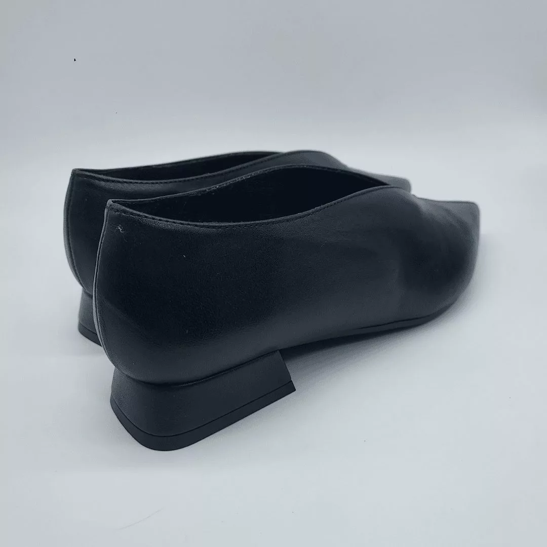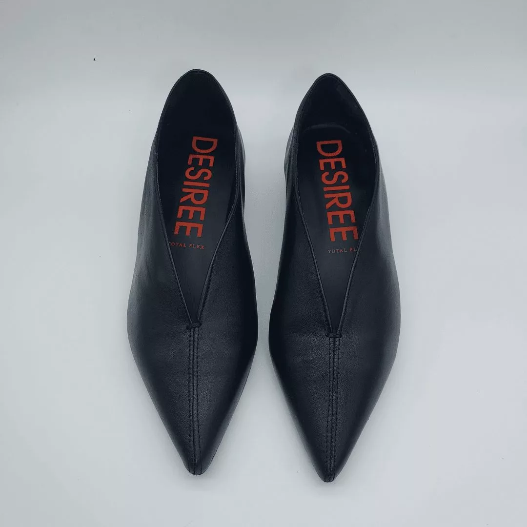 Desireé Mod. Viena 10, Salón en Piel Acabado Nick Negro. Plantilla Acolchada, Sistema Total Flex anti impactos, Puntera Afilada. Tacón Bajo de 2,5 cm de altura con piso engomado antideslizante. Hecho en España.