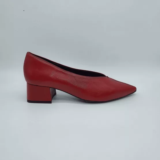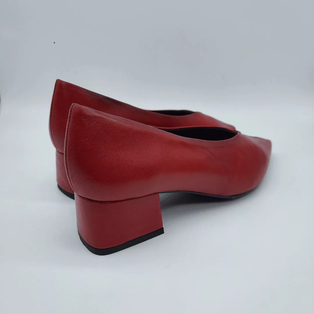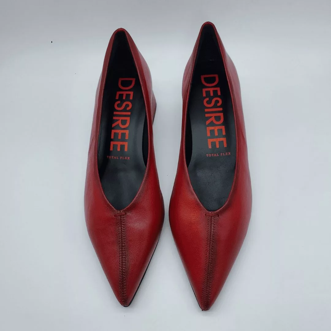 Desireé Mod. Rabat 9, Salón en Piel Acabado Nick Rojo. Plantilla Acolchada, Sistema Total Flex anti impactos, Puntera Afilada. Tacón Grueso de 4,5 cm de altura con piso engomado antideslizante. Fabricado en España.