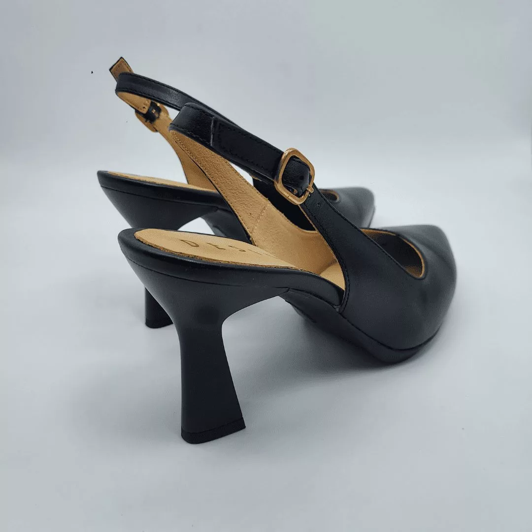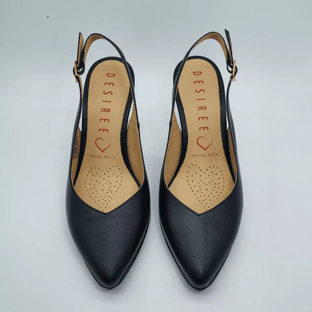 Desireé Mod. SAGA 14, Salón Destalonado fabricado en piel acabado Diana color Negro. Cierre mediante Hebilla ajustable, Plantilla de Gel, Sistema Total Flex anti impactos, Tacón de 7,5 cm. de altura. Fabricado en España.