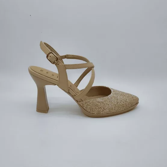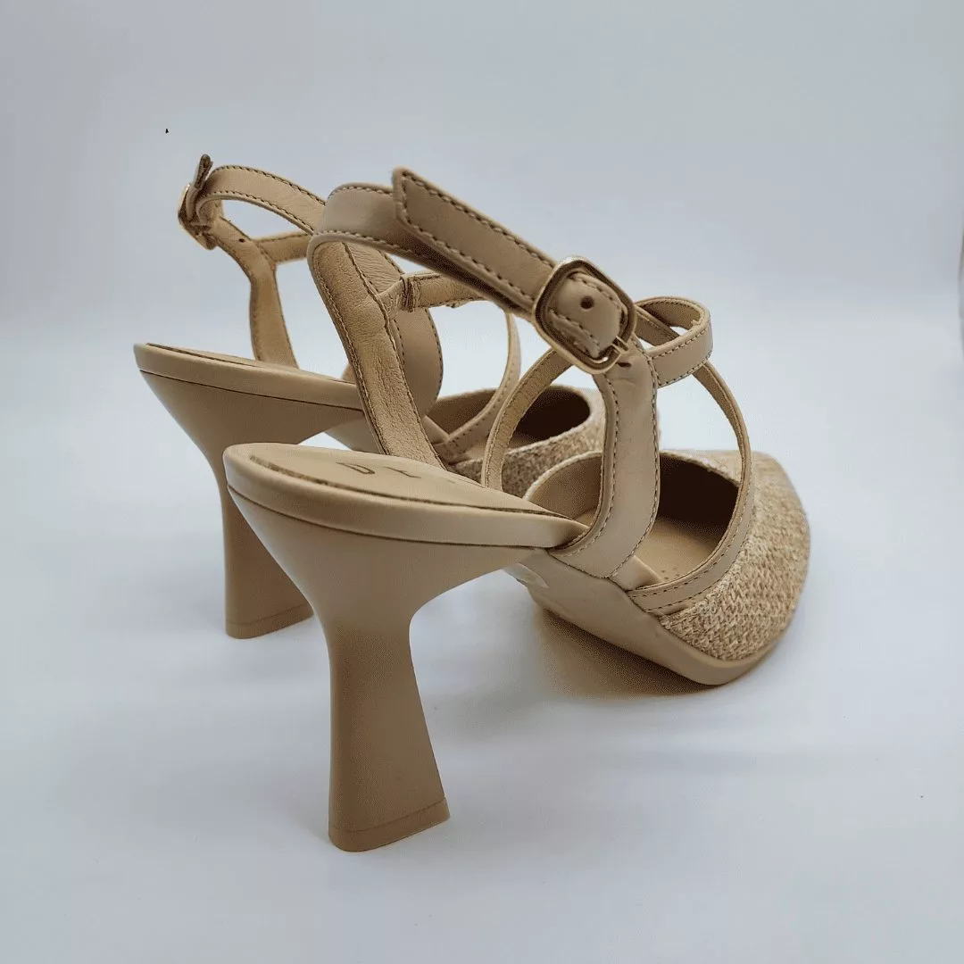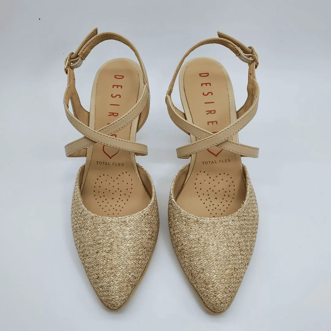 Desireé Mod. SAGA 15, Salón Destalonado con Tiras Cruzadas fabricado en piel combinado con textil acabado color Ecru. Cierre mediante Hebilla, Plantilla de Gel, Sistema Total Flex anti impactos, Tacón de 7,5 cm. de altura. Fabricado en España.