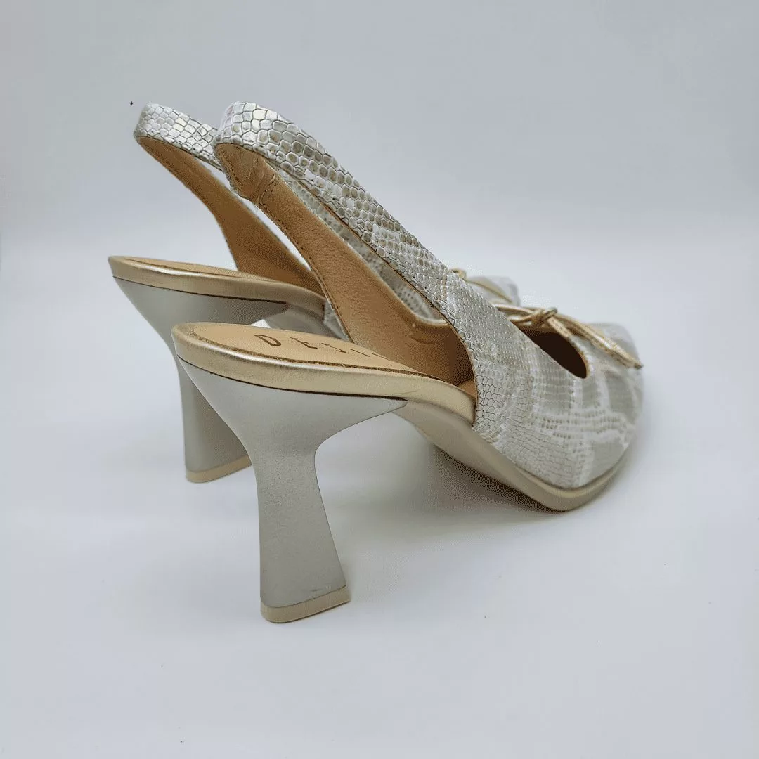 Desireé Mod. SAGA 19, Salón Destalonado fabricado en piel acabado Serpiente combinada con Oro. Cierre mediante Tira elástica posterior para un ajuste perfecto, con Apertura en Pala y detalle de lazada. Plantilla de Gel, Sistema Total Flex anti impactos, Tacón de 7,5 cm. de altura. Fabricado en España.