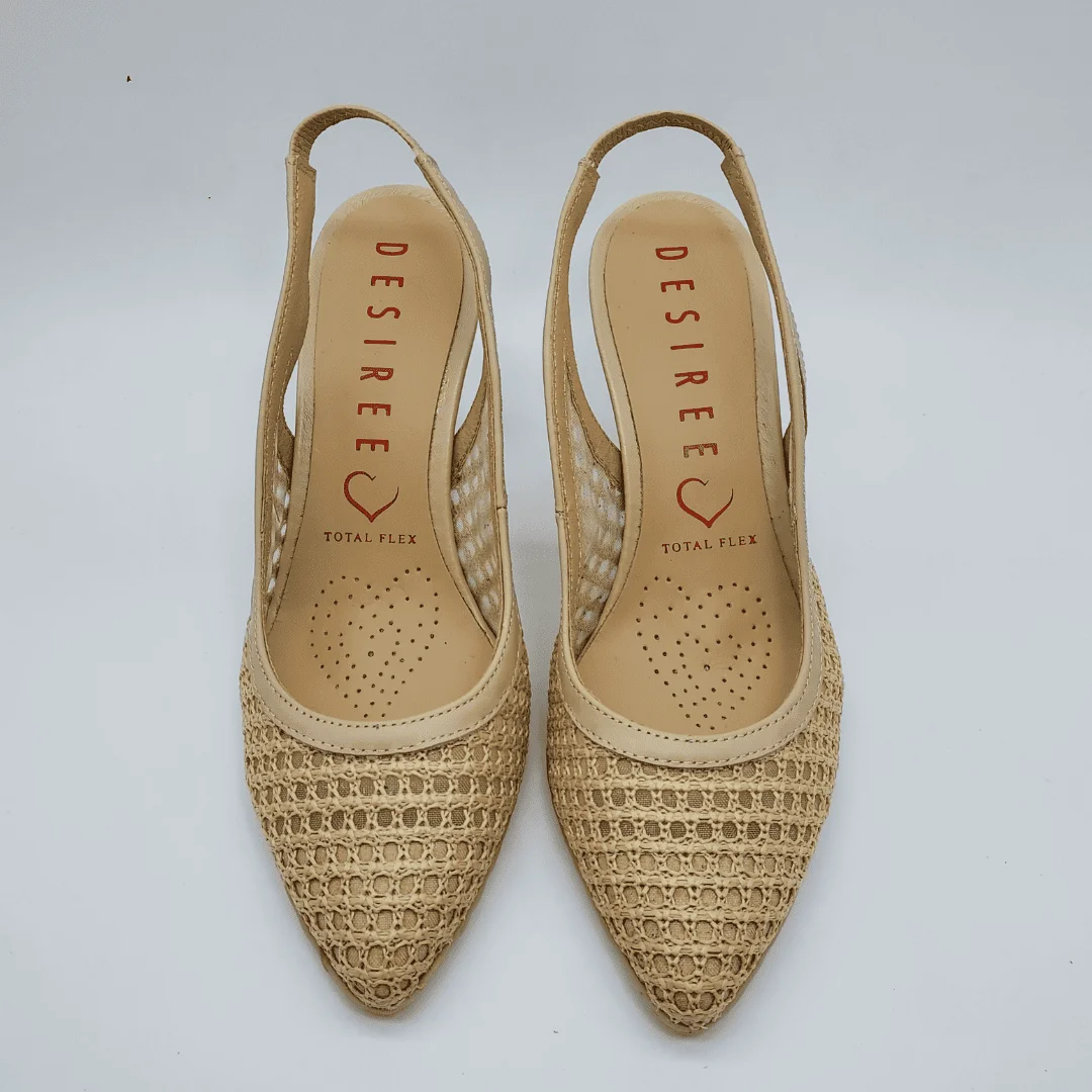 Desireé Mod. SAGA 22, Salón Destalonado fabricado en piel acabado Combinado Ecru. Cierre mediante Tira elástica posterior para un ajuste perfecto, Plantilla de Gel, Sistema Total Flex anti impactos, Tacón de 7,5 cm. de altura. Fabricado en España.