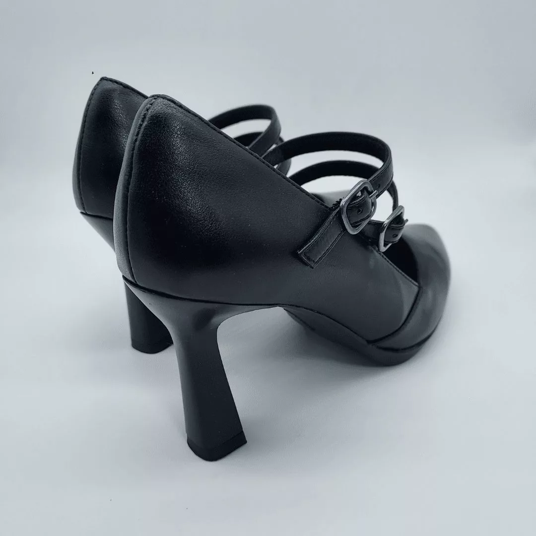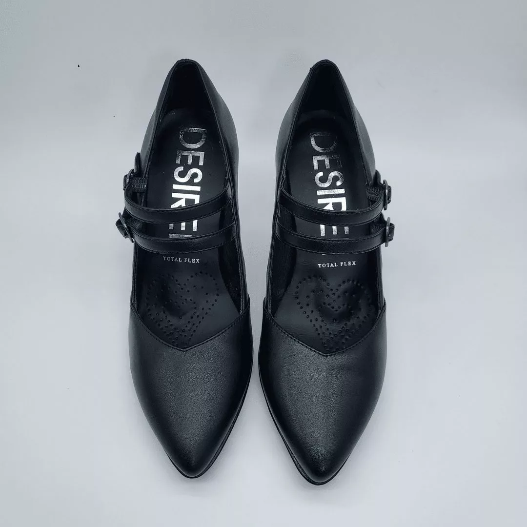 Desireé Mod. Syra 22, Salón en Piel Acabado Diana color Negro. Con Sistema Total Flex anti impactos, Tacón de 8,5 cm, Cierre mediante Hebilla Doble. Suela de goma termoplástica, con Plantilla Interior Acolchada. Hecho en España.