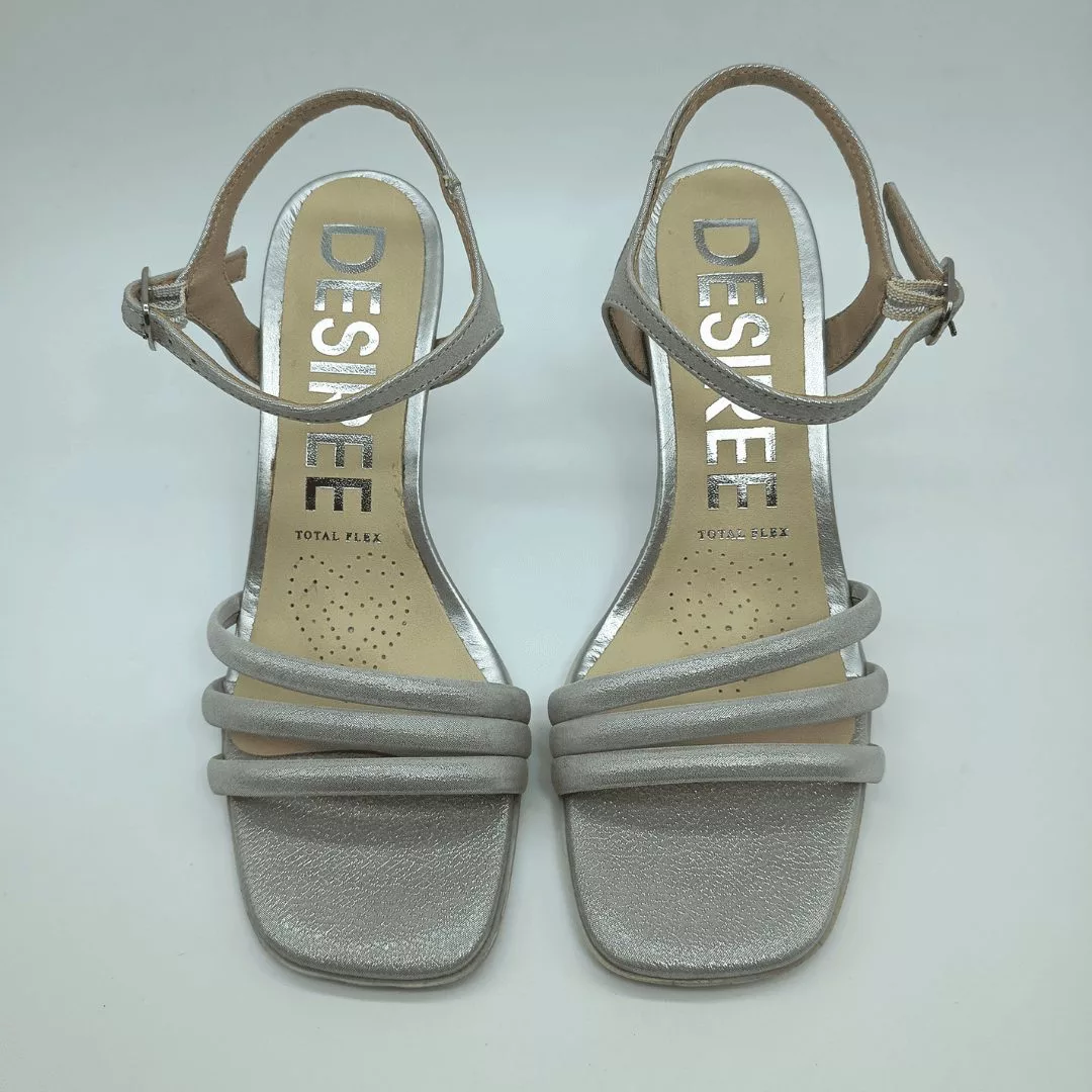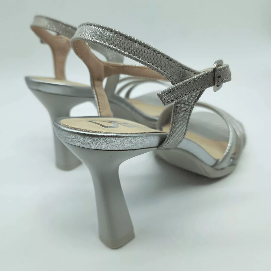 Desireé Mod. ALEXA 4, Sandalia Destalonada fabricada en piel lisa con Tiras acabado color Perla. Cierre mediante Hebilla, Plantilla de Gel, Sistema Total Flex anti impactos, Tacón de 7,5 cm de altura con piso engomado de 1 cm antideslizante. Hecha en España.