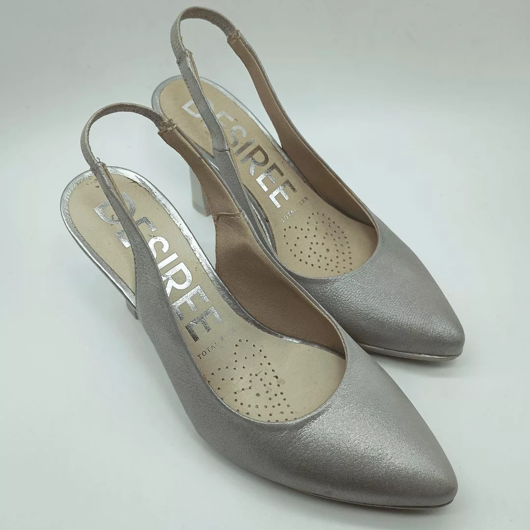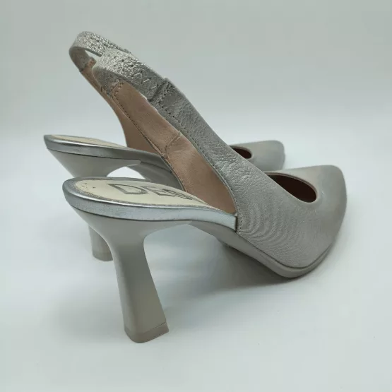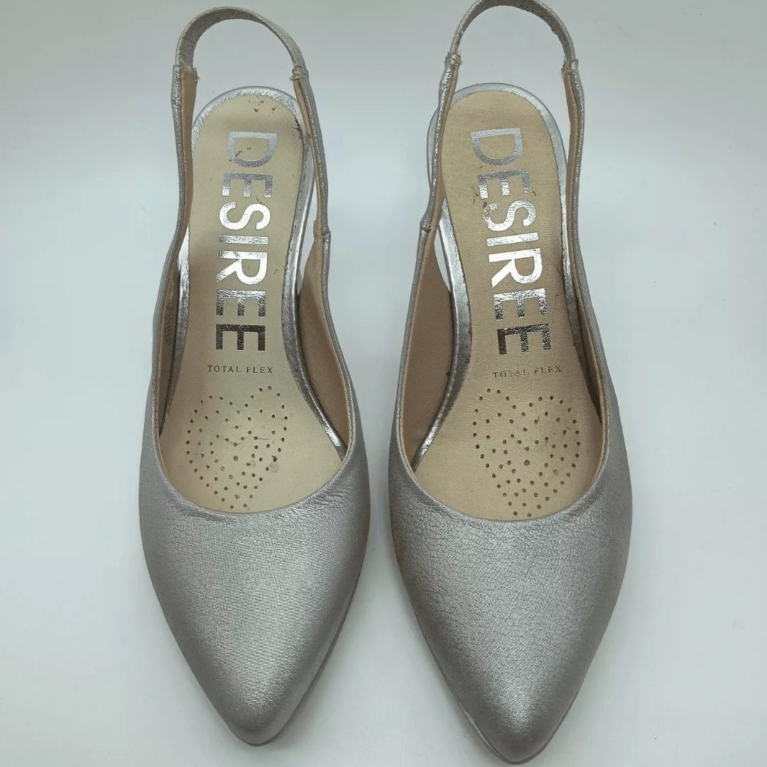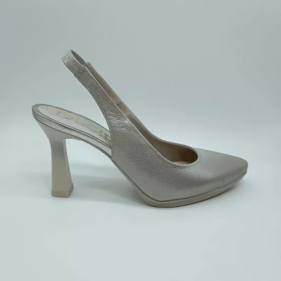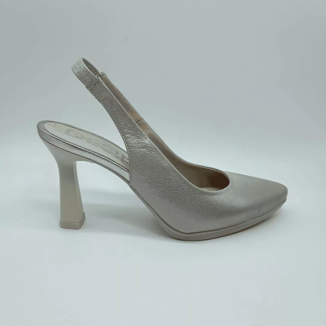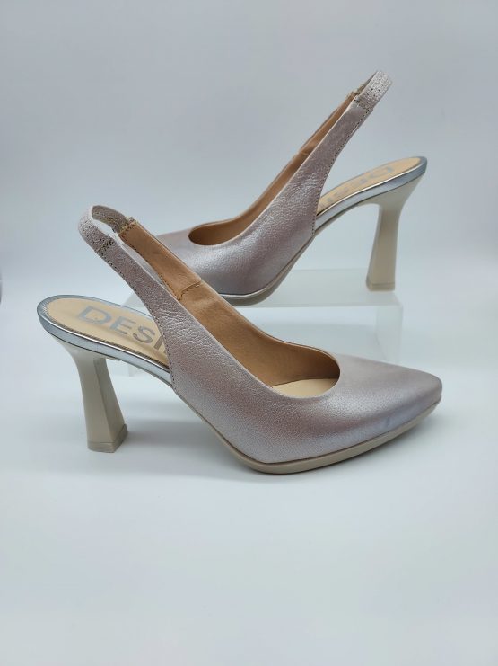 Desireé Mod. SYRA 2, Salón Destalonado fabricado en piel blanda acabado Perla, con diseño en la pala que estiliza el pie. Cierre mediante elástico en el talón, Plantilla de Gel, Sistema Total Flex anti impactos, Tacón con base de 7,5 cm de altura con piso engomado de 1 cm antideslizante. Fabricado en España.