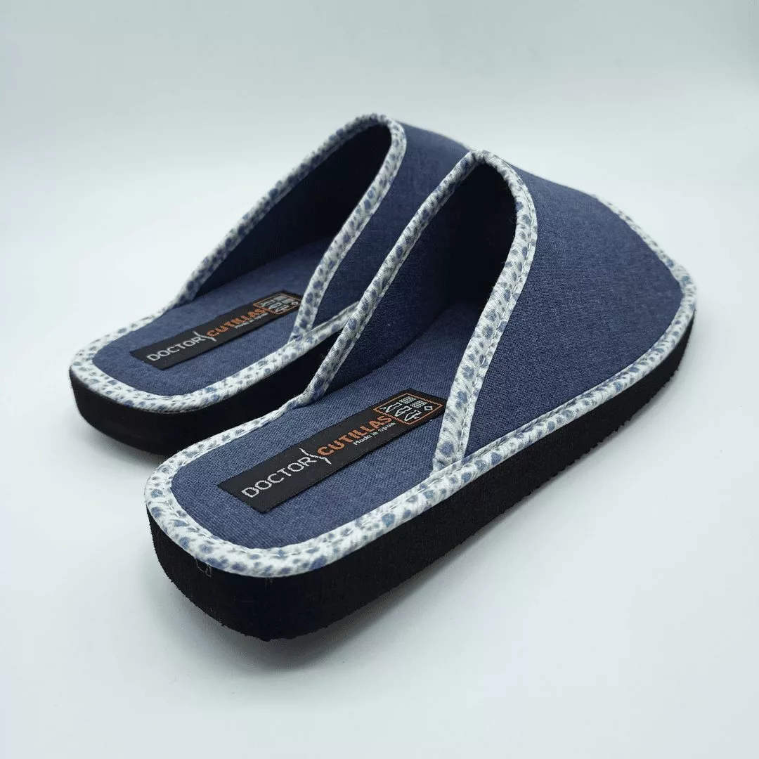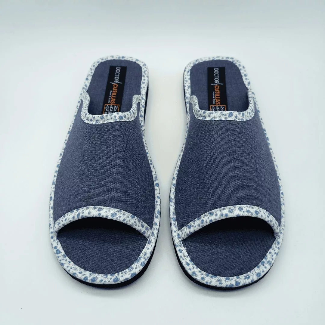 Doctor Cutillas Mod. 24504, Zapatilla Plana Abierta, confeccionada en Tejido Textil, acabado color Azul, con Ribete de Flores. Suela de Eva. Hecha en España. Envío, Devolución y Reembolso