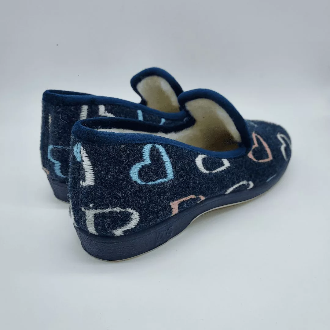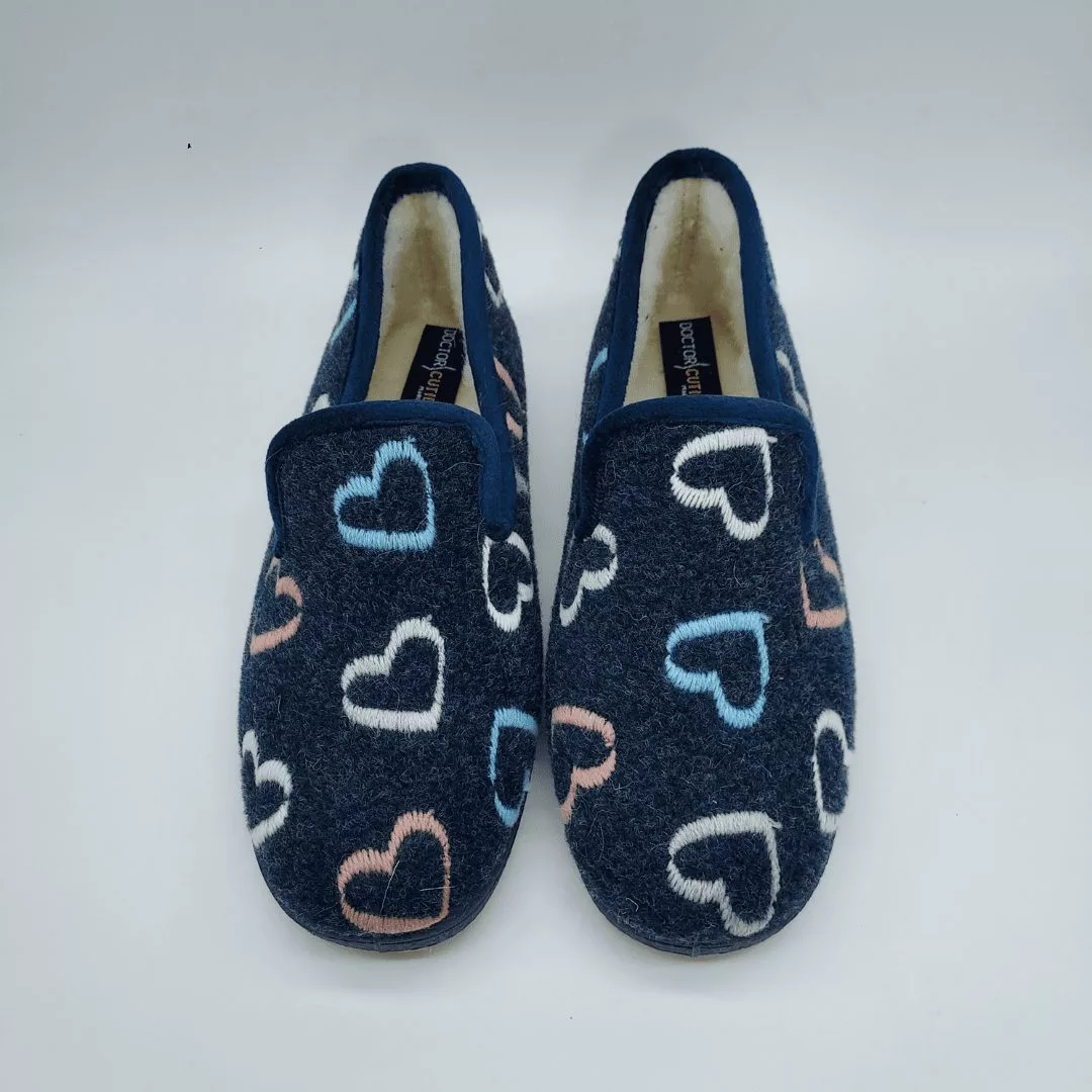 Doctor Cutillas Mod. 363, Zapatilla Cerrada en Textil con adorno bordado de Corazones, Ribete y Suela de Goma en color Marino. Forro de Lana Virgen. Hecha en España. Envío, Devolución y Reembolso