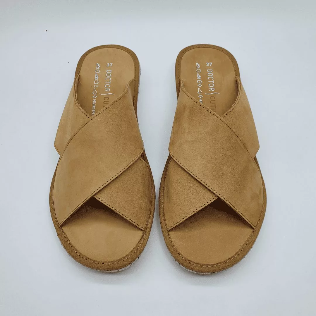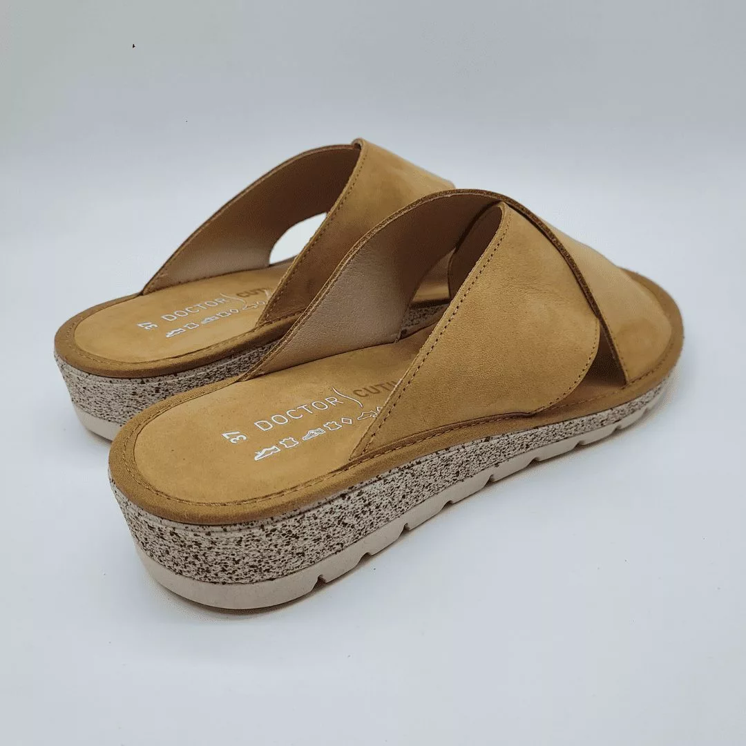Doctor Cutillas Mod. 35337, Sandalia de Cuña tipo Bio en Piel con Tiras Cruzadas acabado color Cuero, Suela Goma. Plantilla de Piel, Altura Cuña 3,5 cm. Puntera Abierta. Hecha en España.