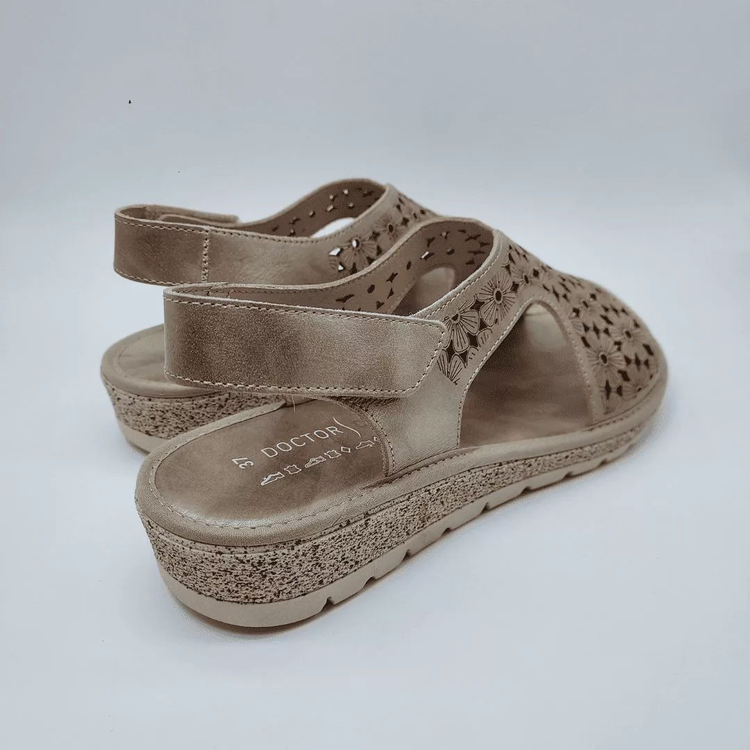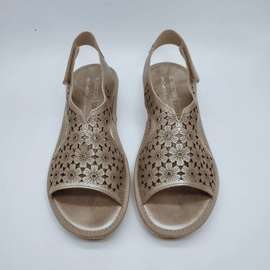 Doctor Cutillas Mod. 35344, Sandalia de Cuña tipo Bio en Piel Picada con estampado floral acabado color Pico, Suela Goma. Plantilla de Piel, Altura Cuña 3,5 cm. Puntera Abierta. Cierre adaptable al tobillo mediante velcro. Hecha en España.