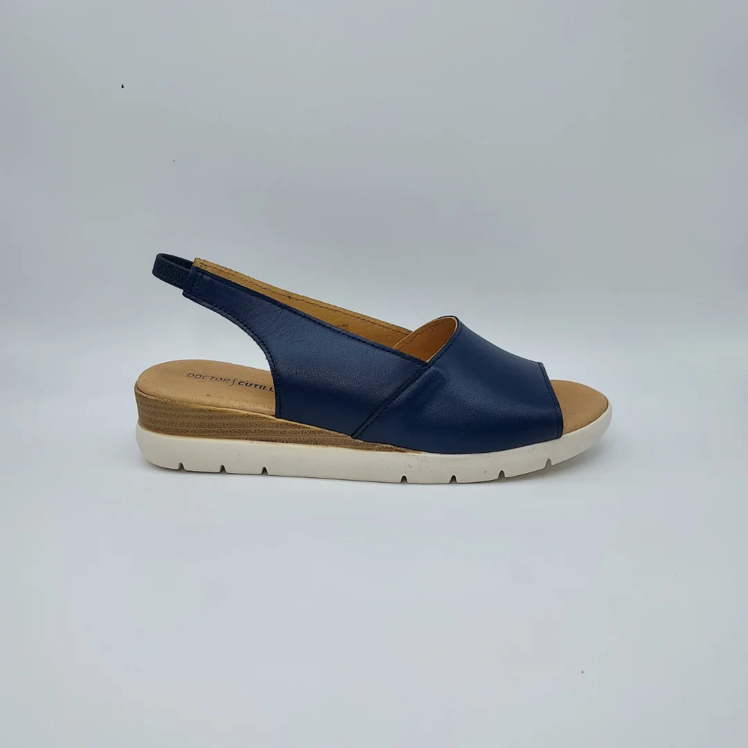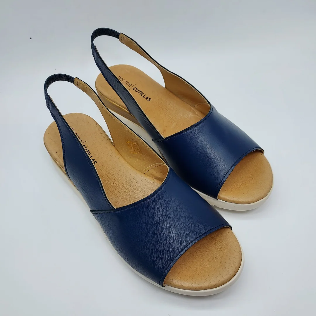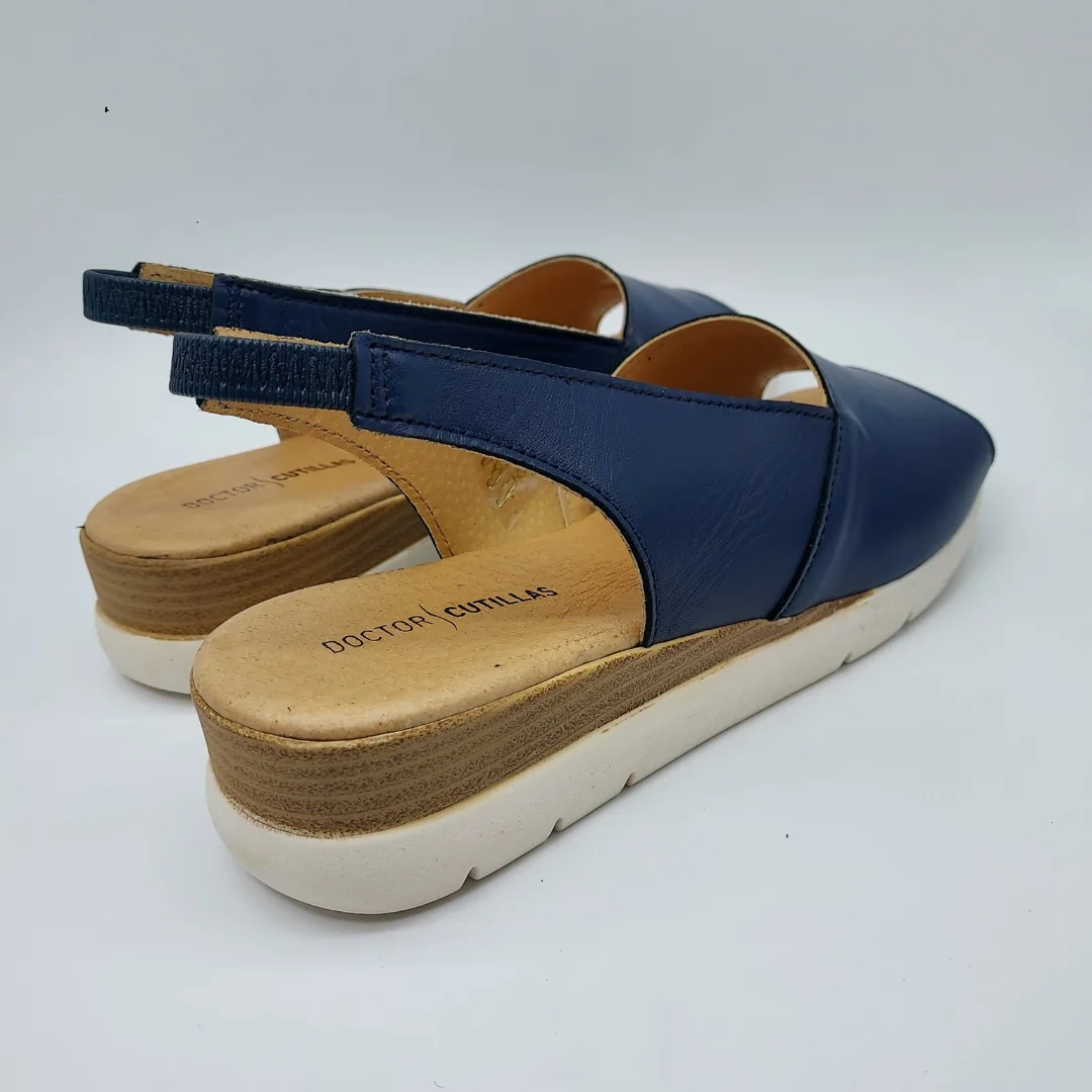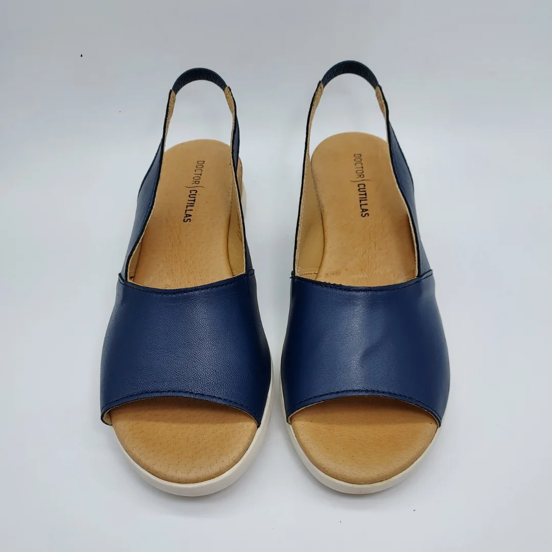 Doctor Cutillas Mod. 37850, Sandalia en Piel acabado color Marino con Apertura en Puntera. Con Forro y Plantilla de Piel. Cuña Bicolor de 3,5 cm y Plataforma delantera de 1,5 cm. Cierre mediante Tira elástica trasera para un ajuste perfecto.
