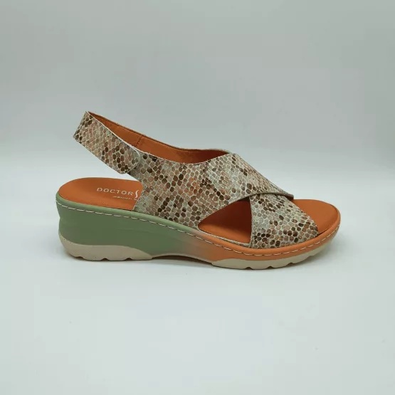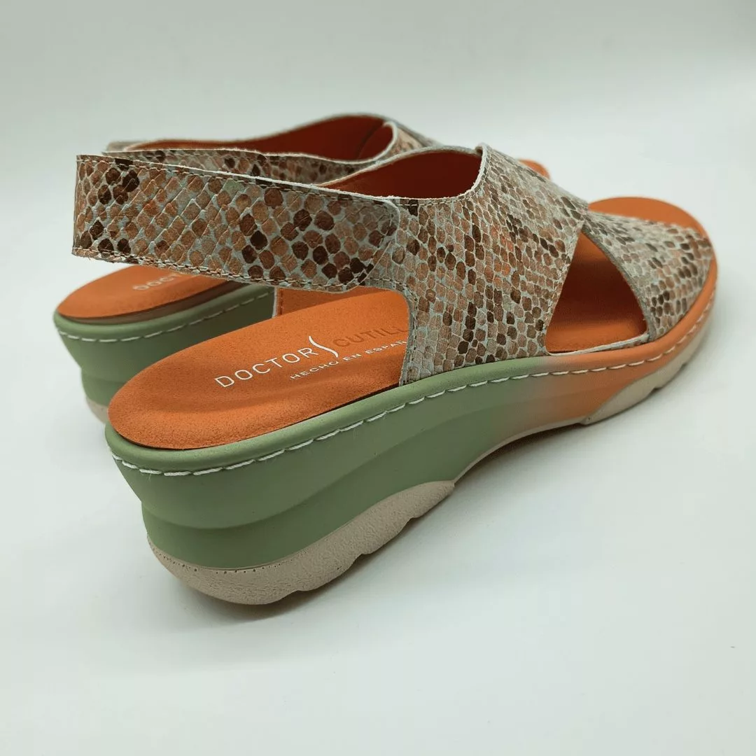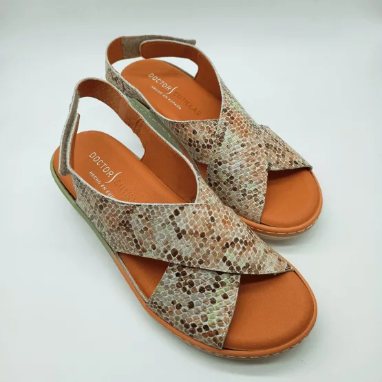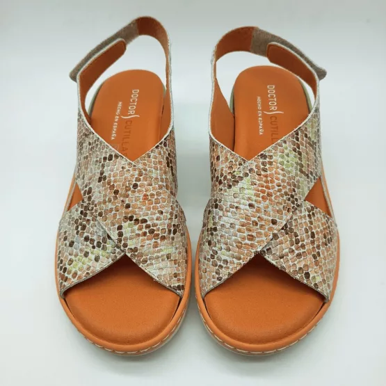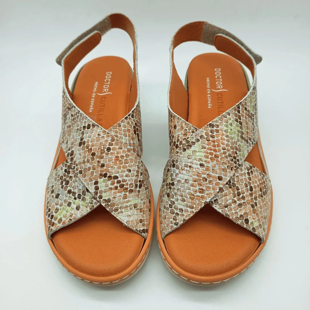 Doctor Cutillas Mod. 49101, Sandalia en Piel Grabada con Tiras Cruzadas acabado Arena, Plantilla Extraible, Cierre adaptable al tobillo mediante velcro. Cuña de 4,5 cm de altura y delantera de 1 cm. Hecha en España.