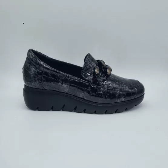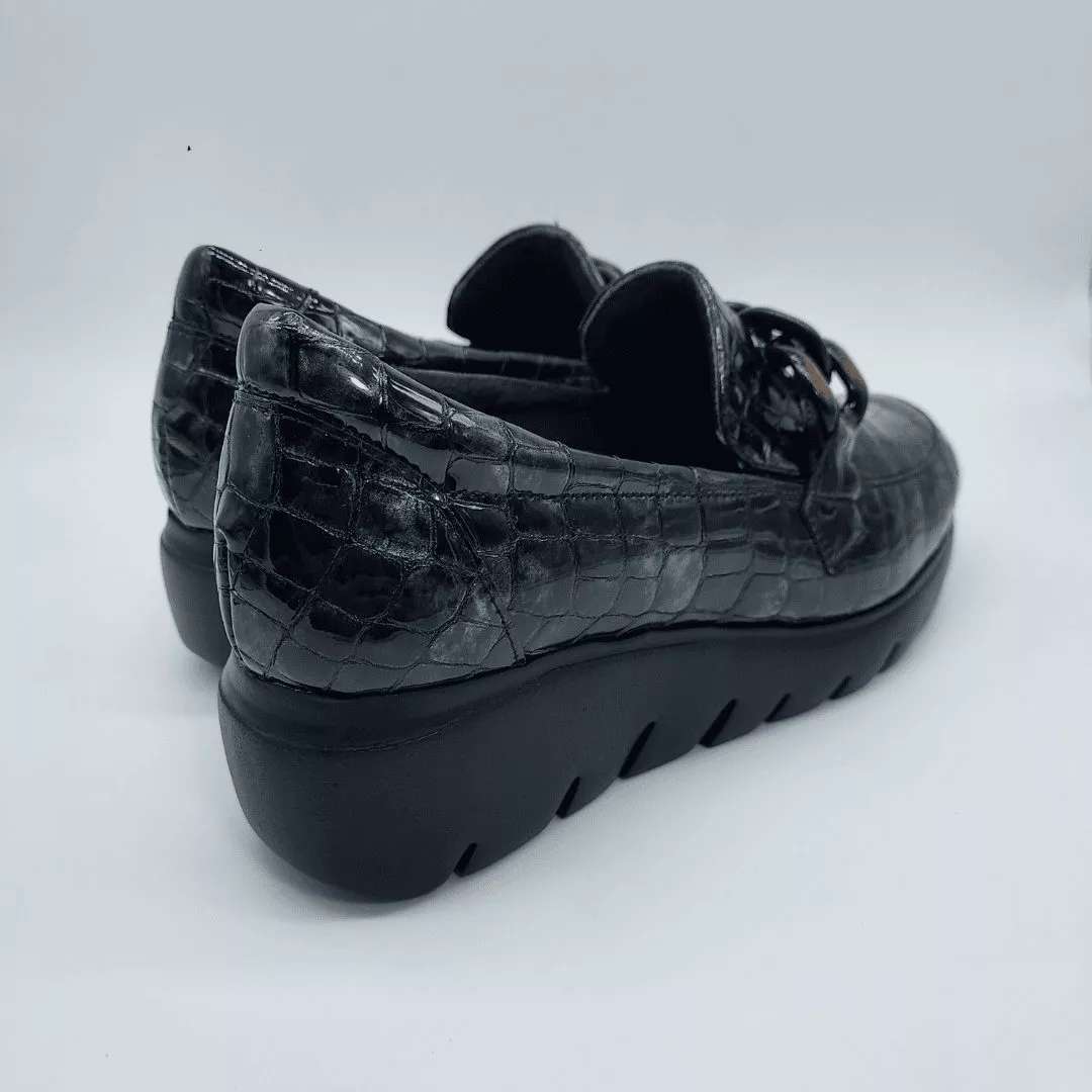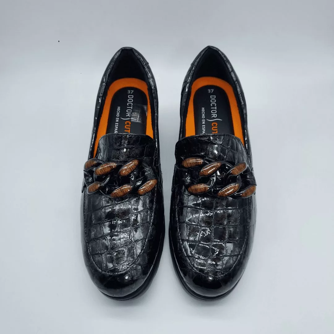 Doctor Cutillas Mod. 89555, Mocasín en Piel Acharolada simil cocodrilo acabado color Baltic, Plantilla Extraible Acolchada. Forro Interior Textil con Aloe Vera, detalle de cadena en el empeine. Cuña de 4,5 cm, con plataforma de 2 cm, Suela Comfort Light. Hecho en España.