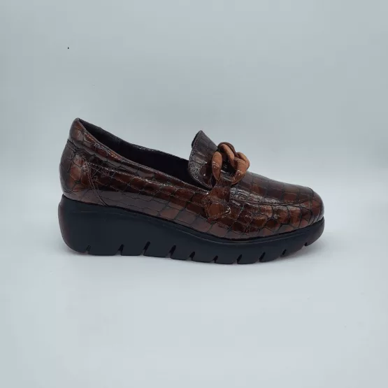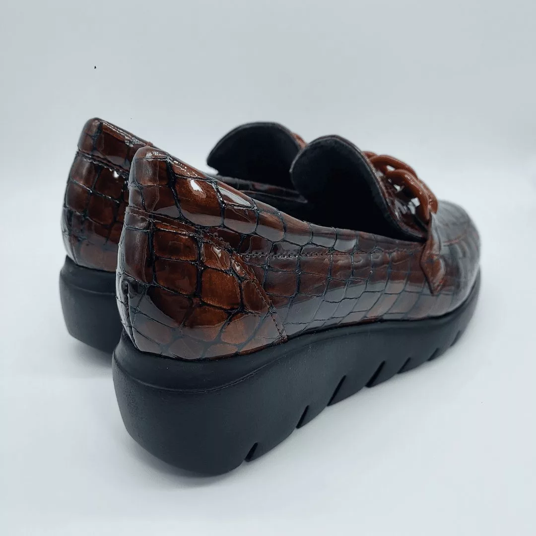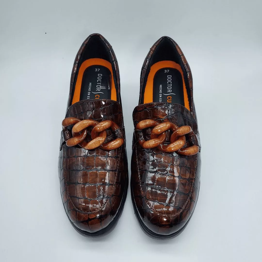 Doctor Cutillas Mod. 89555, Mocasín en Piel Acharolada simil cocodrilo acabado color Marrón, Plantilla Extraible Acolchada. Forro Interior Textil con Aloe Vera, detalle de cadena en el empeine. Cuña de 4,5 cm, con plataforma de 2 cm, Suela Comfort Light. Hecho en España.