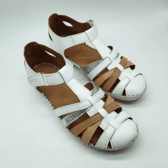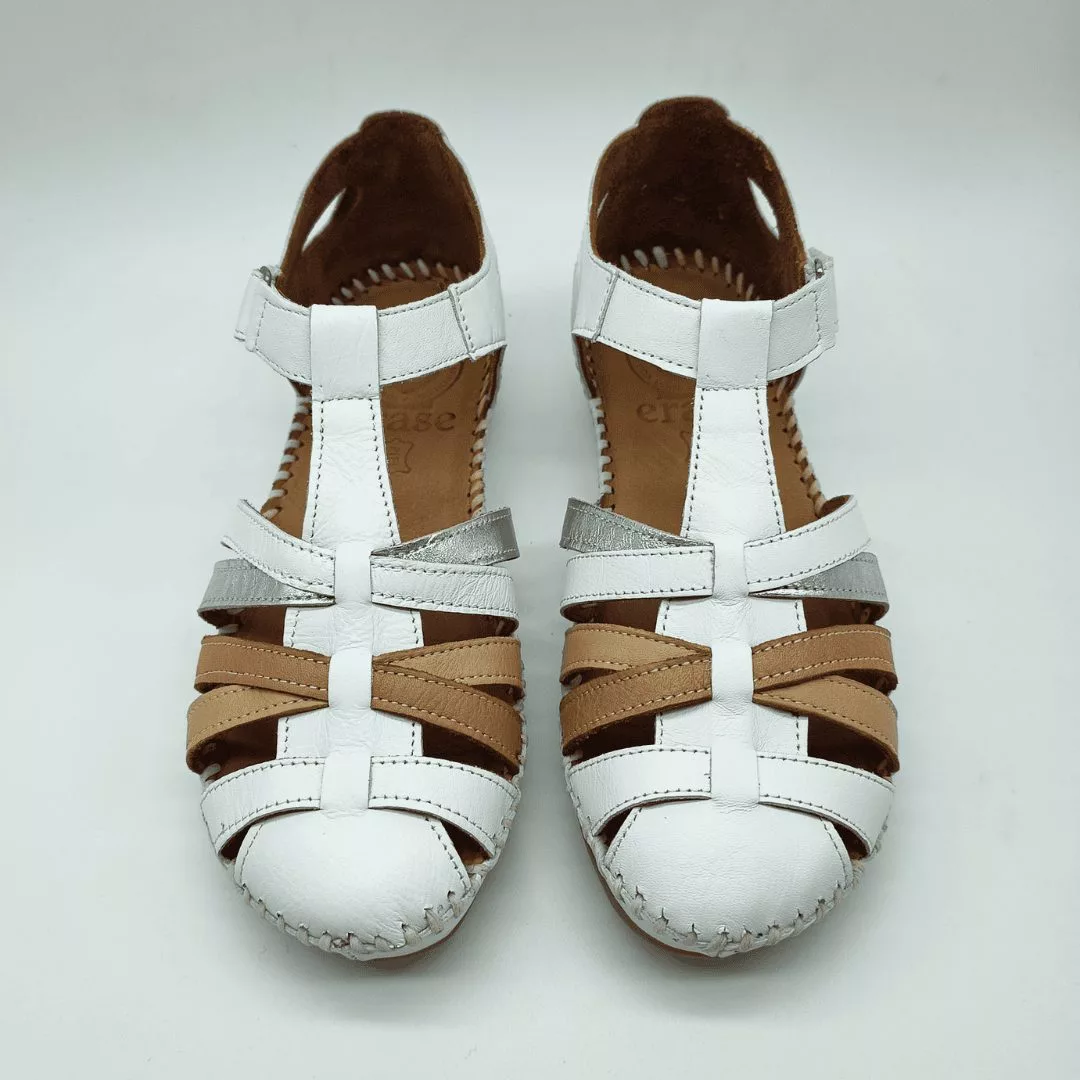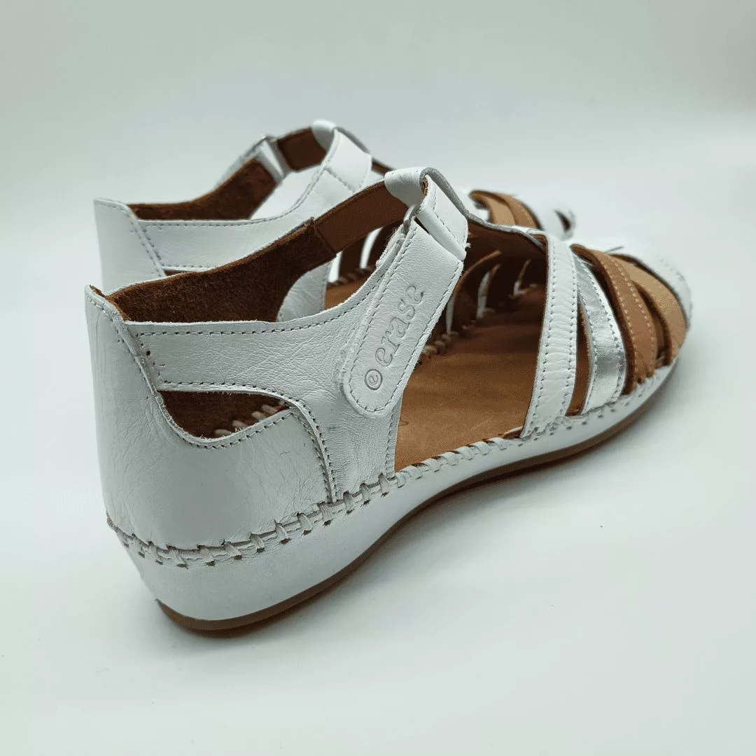 Erase Mod. Ceres 793-56, Sandalia en Piel con Puntera y Talonera Cerrada Acabado color Blanco con Tiras Cruzadas de diferentes acabados, cuña de 2,5 cm de altura, con Plantilla acolchada de piel, cierre mediante Velcro regulable. Suelo de Goma Flexible.