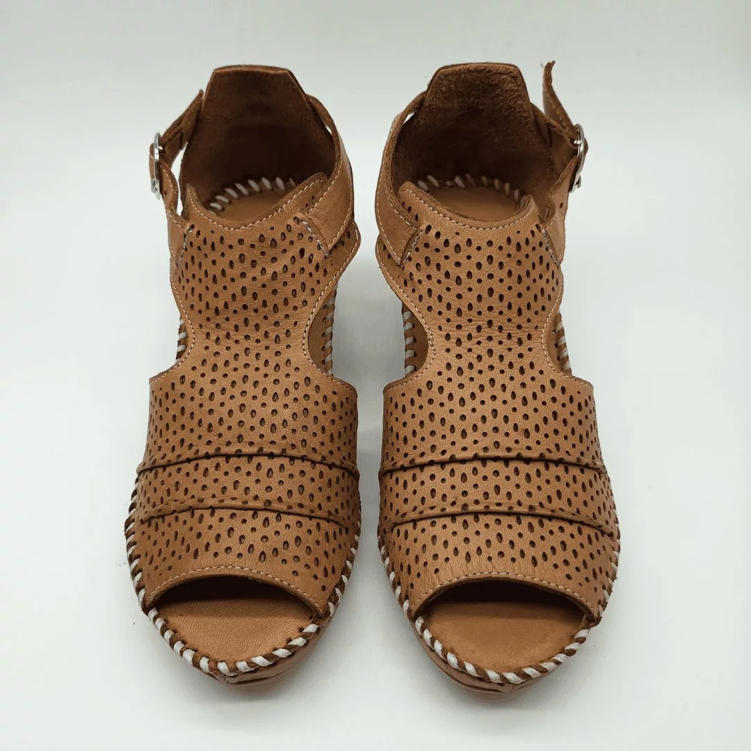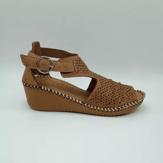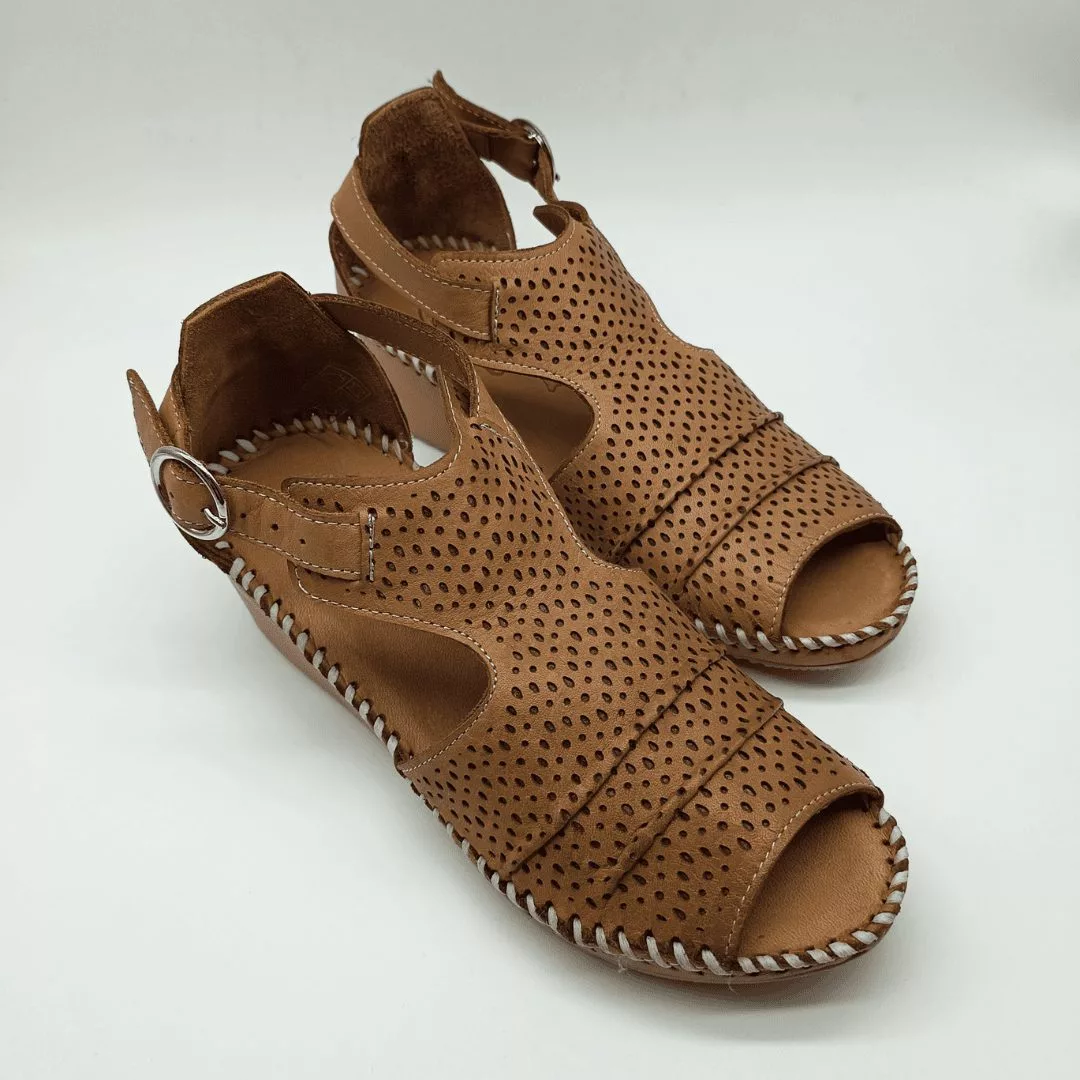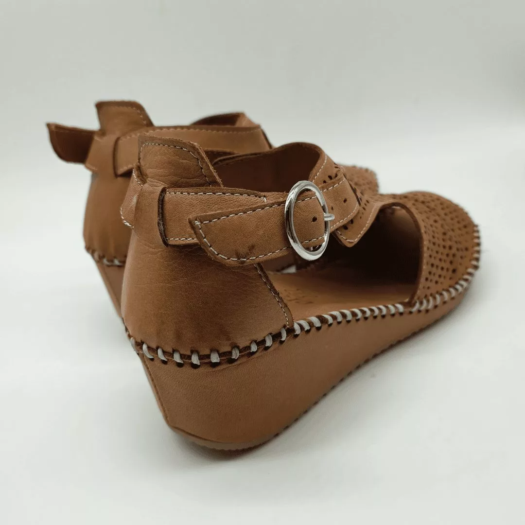 Erase Mod. Ceres 793-57, Sandalia Semicubierta en Piel Calada con Puntera Abierta y Talonera Cerrada Acabado color Cuero, cuña de 4,5 cm de altura, con Plantilla acolchada de piel, cierre mediante Hebilla. Suelo de Goma Flexible.