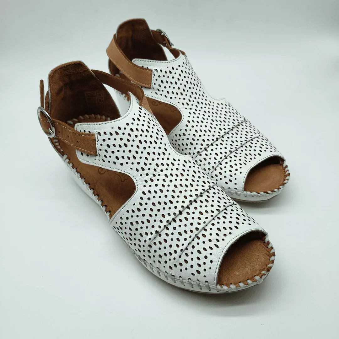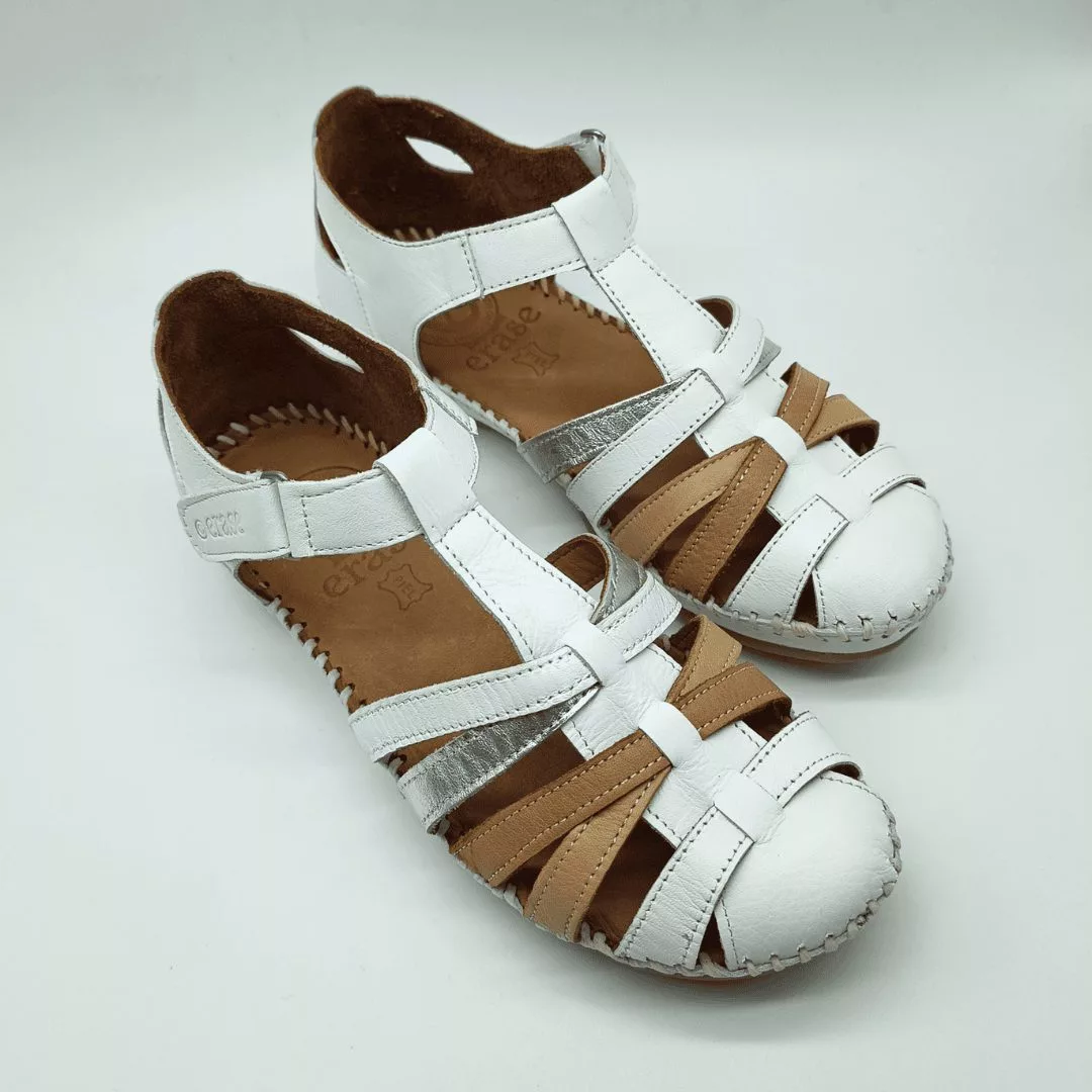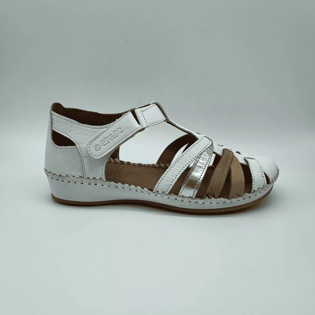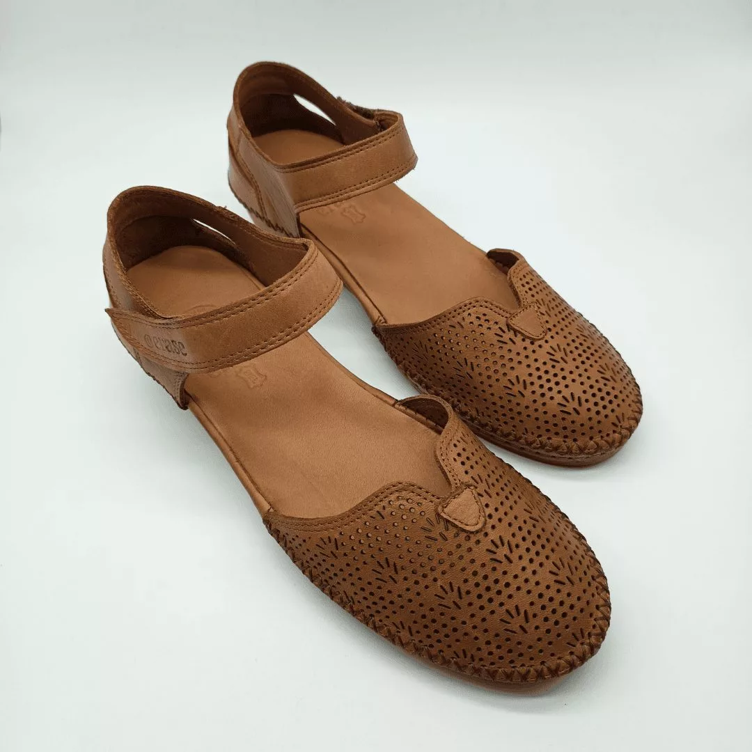 Erase Mod. Ceres 793-57, Sandalia Semicubierta en Piel Calada con Puntera Abierta y Talonera Cerrada Acabado color Cuero, cuña de 4,5 cm de altura, con Plantilla acolchada de piel, cierre mediante Hebilla. Suelo de Goma Flexible.