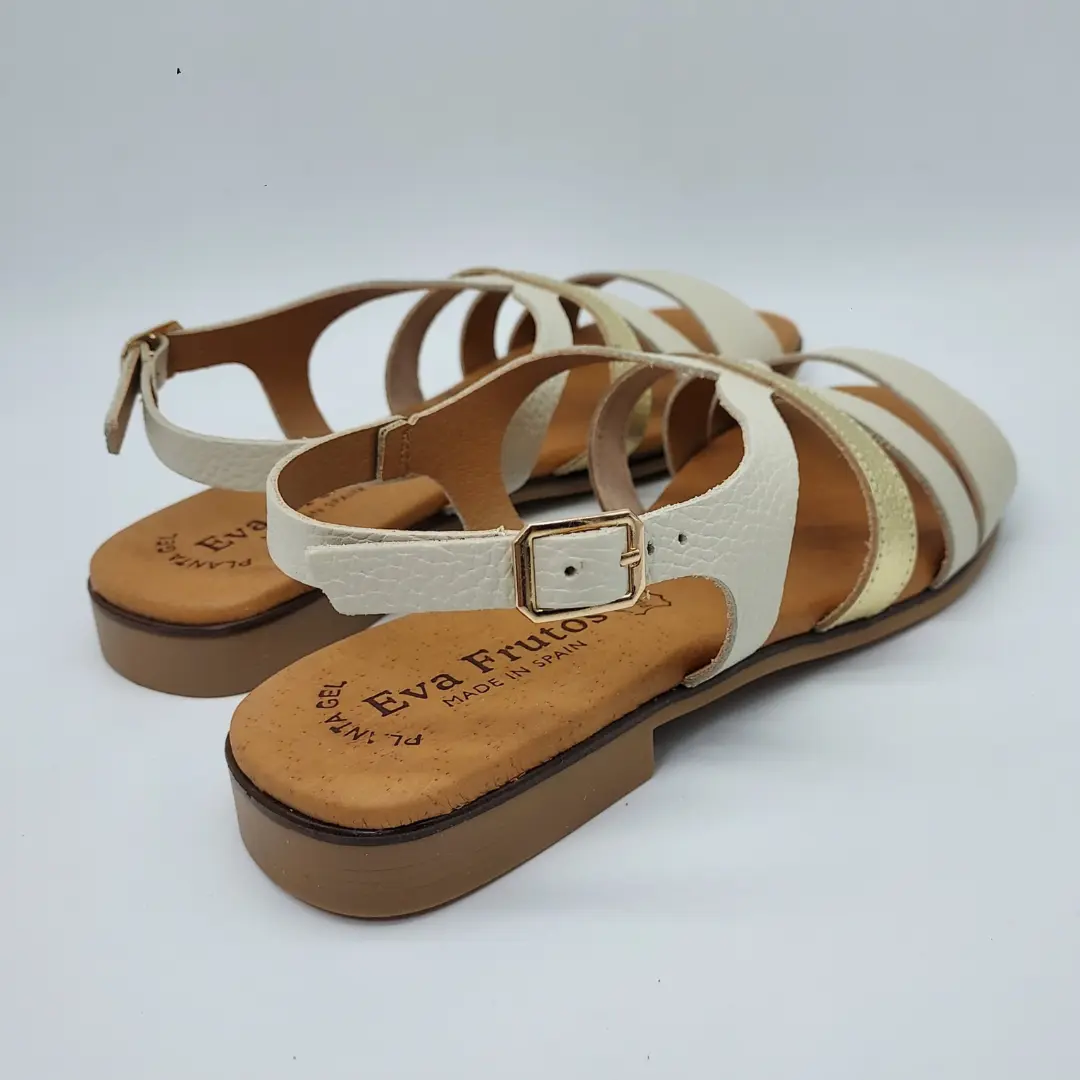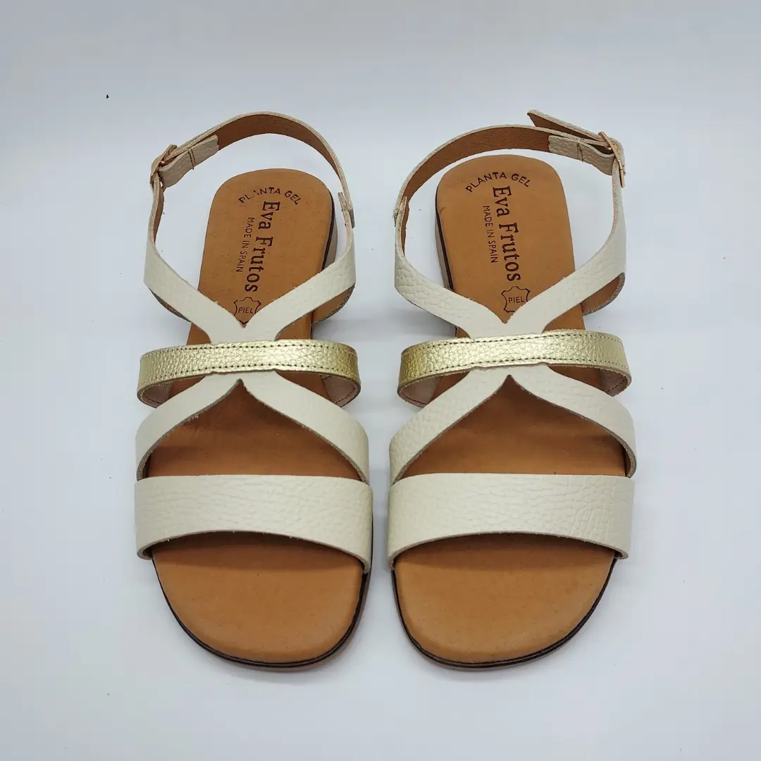Eva Frutos Mod. 3060, Sandalia en Piel Grabada, Acabado color Beige con detalle de tira en color Oro. Plantilla de Gel. Tacón de 1,5 cm. de altura. Con Cierre Mediante Hebilla. Hecha en España.