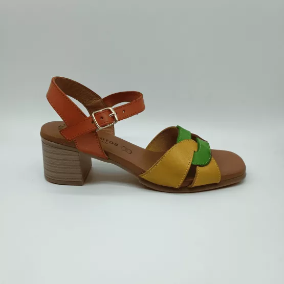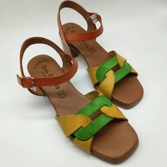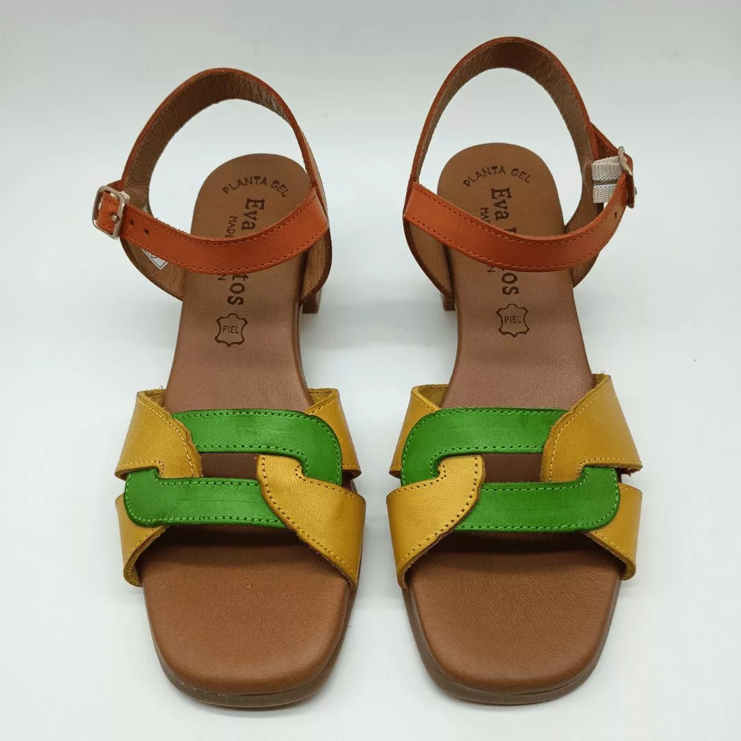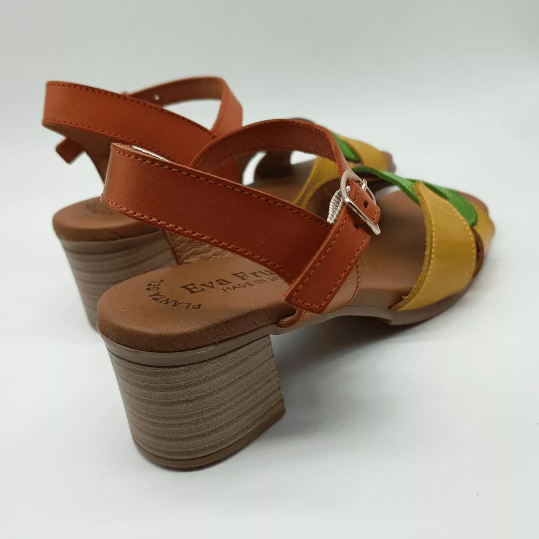Eva Frutos Mod. 3485, Sandalia en Piel con Tiras Entrelazadas acabado Naranja combinado con Amarillo y Verde, Tacón Grueso de 5,5 cm, cierre mediante Hebilla, con Plantilla de Gel. Hecha en España.