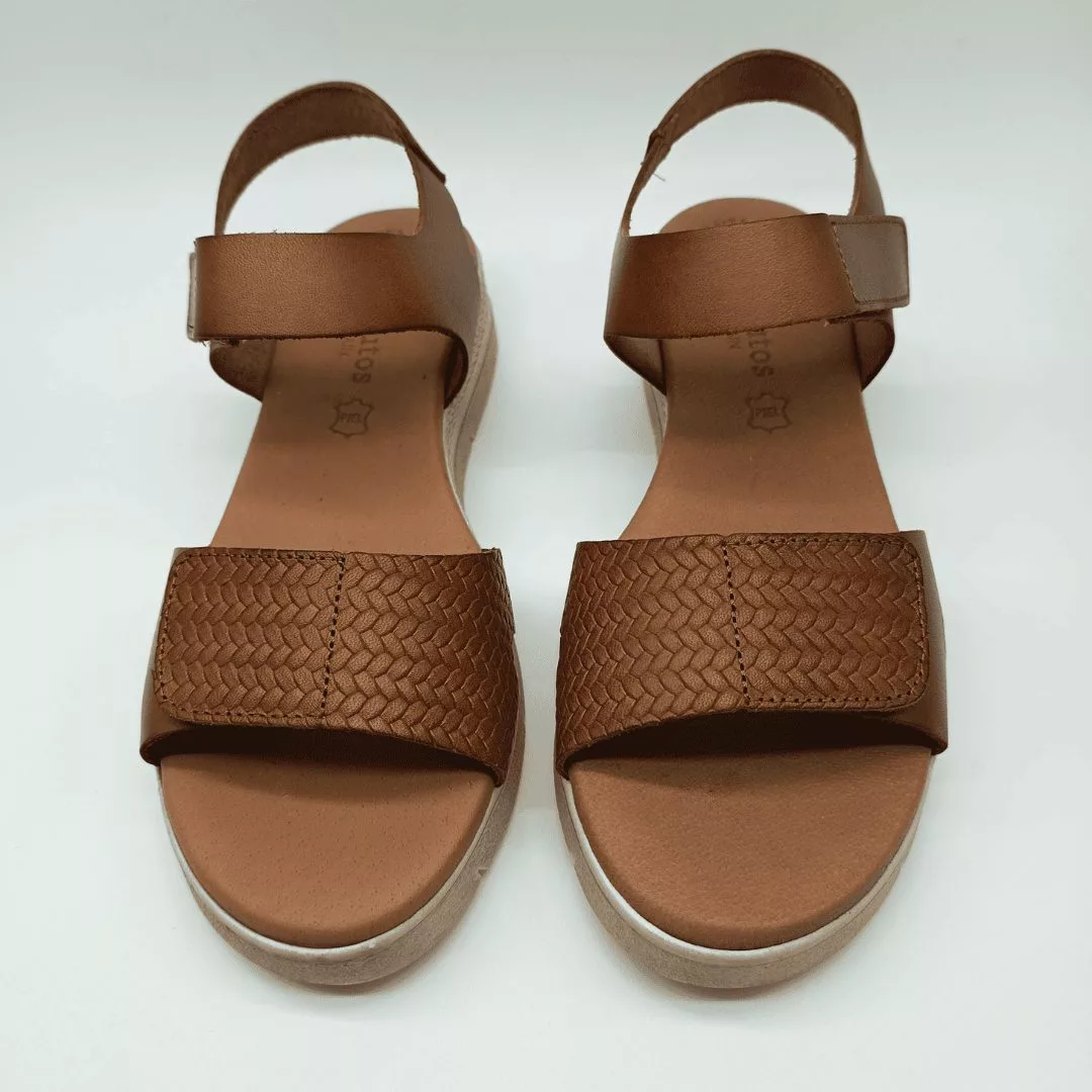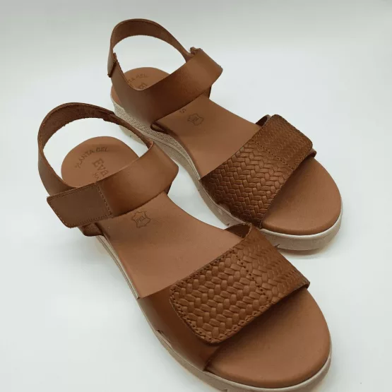 Eva Frutos Mod. 5265, Sandalia en Piel acabado color Avellana, Cuña Bicolor de 3,5 cm y Plataforma delantera de 1 cm, Cierre tipo mediante Velcro (2), con Plantilla de Gel. Hecha en España.