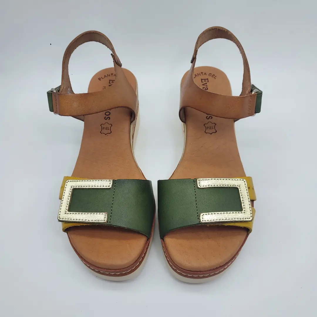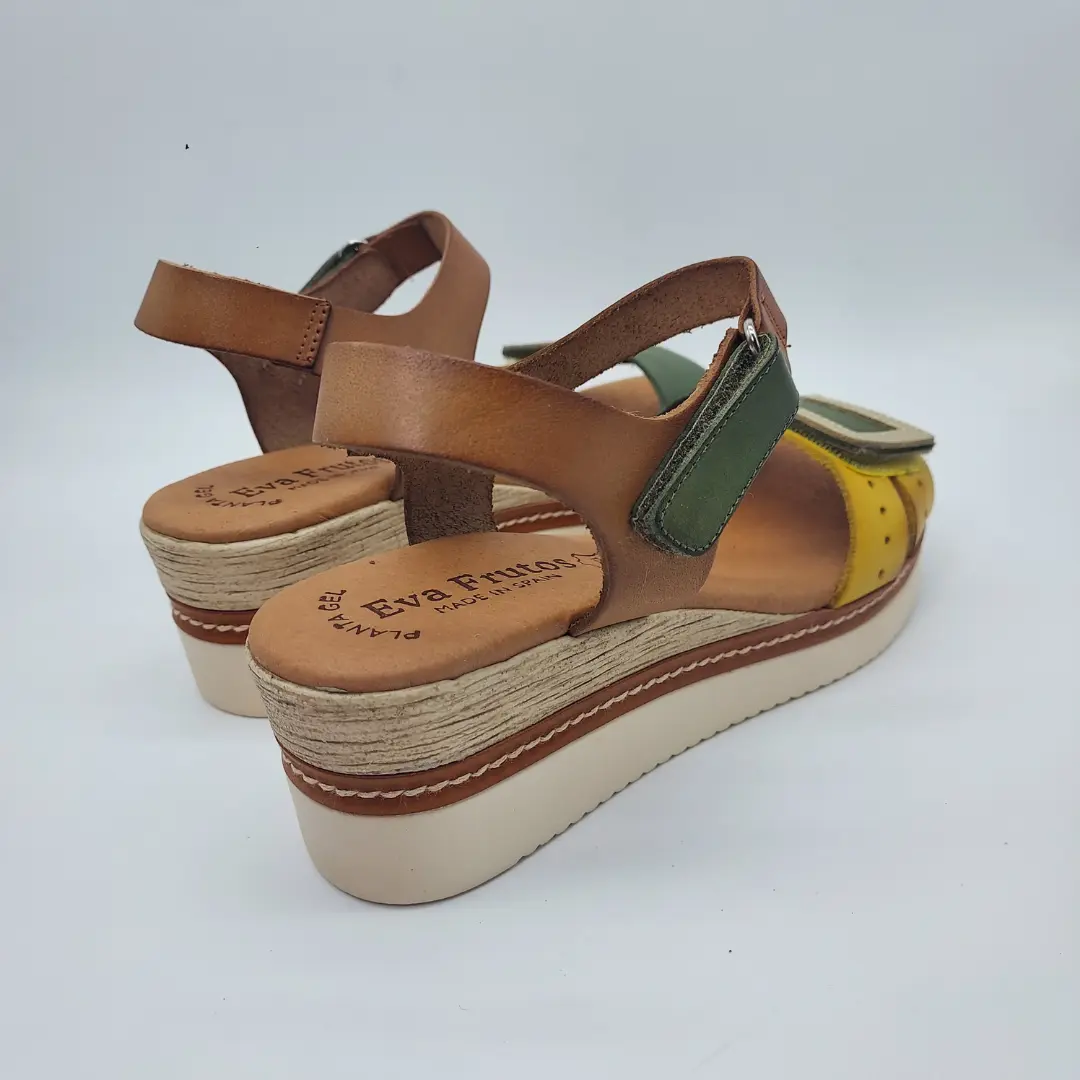 Eva Frutos Mod. 558, Sandalia en Piel acabado color Avellana combinado con Amarillo y Verde, Cuña Tricolor de 5,5 cm y Plataforma delantera de 2 cm, Cierre mediante Velcro Doble, detalle dorado en Pala, con Plantilla de Gel. Hecha en España.
