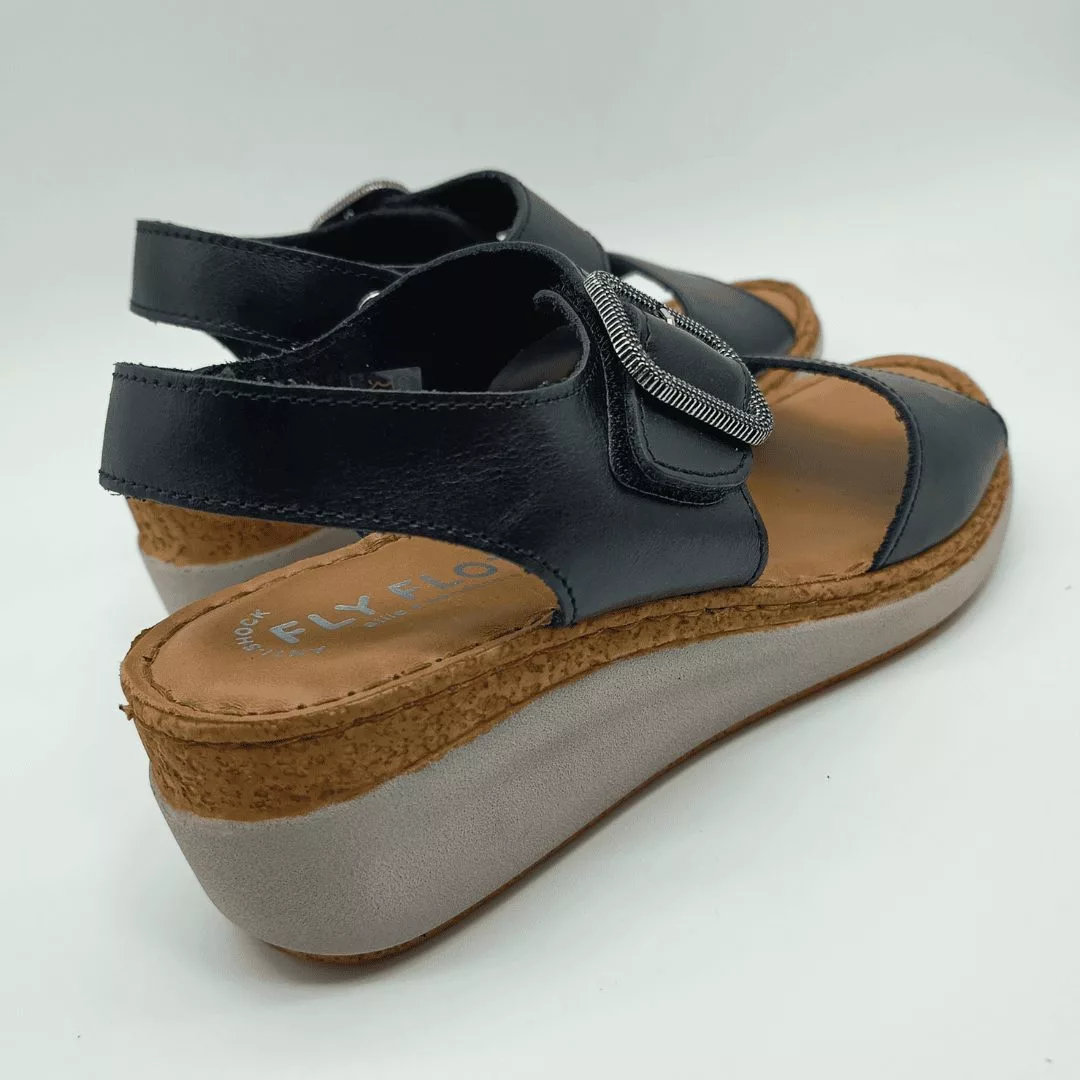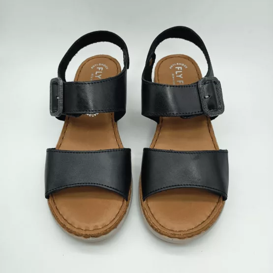 Fly Flot Mod. 36J49-MG, Sandalia en Piel acabado color Black, Plantilla de Piel Anatómica y Anti-Shock, Cuña de 5,5 cm. de altura y plataforma de 1 cm, Cierre Ajustable mediante Velcro, con adorno de Hebilla. Con detalles de Costura cosidos a mano.