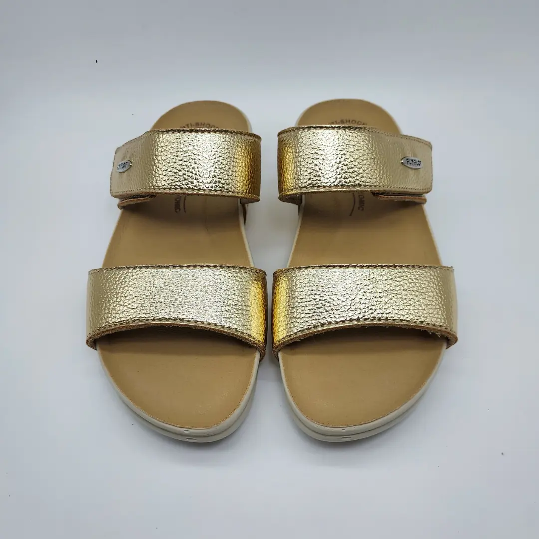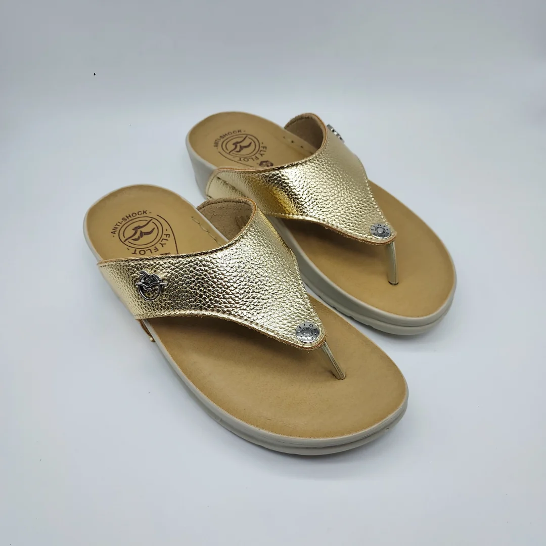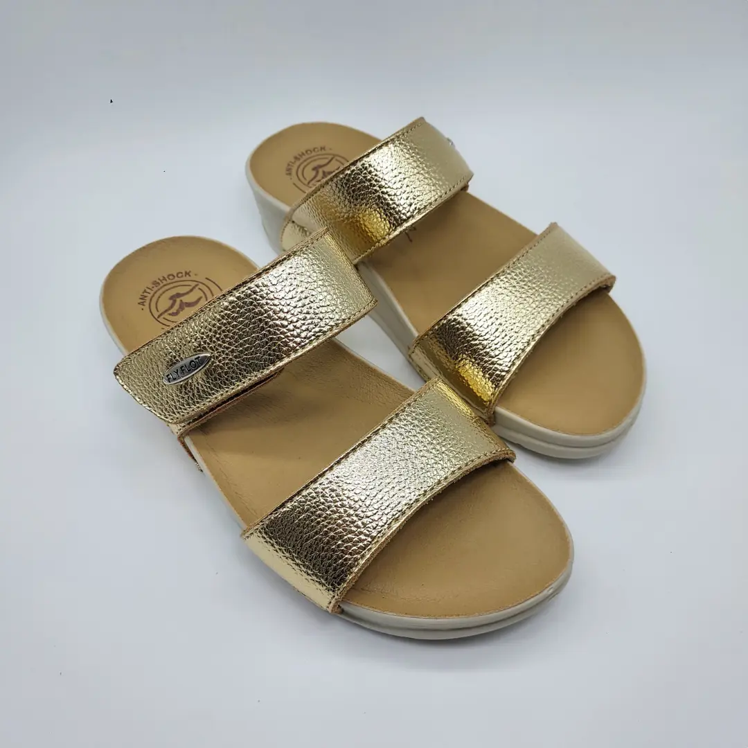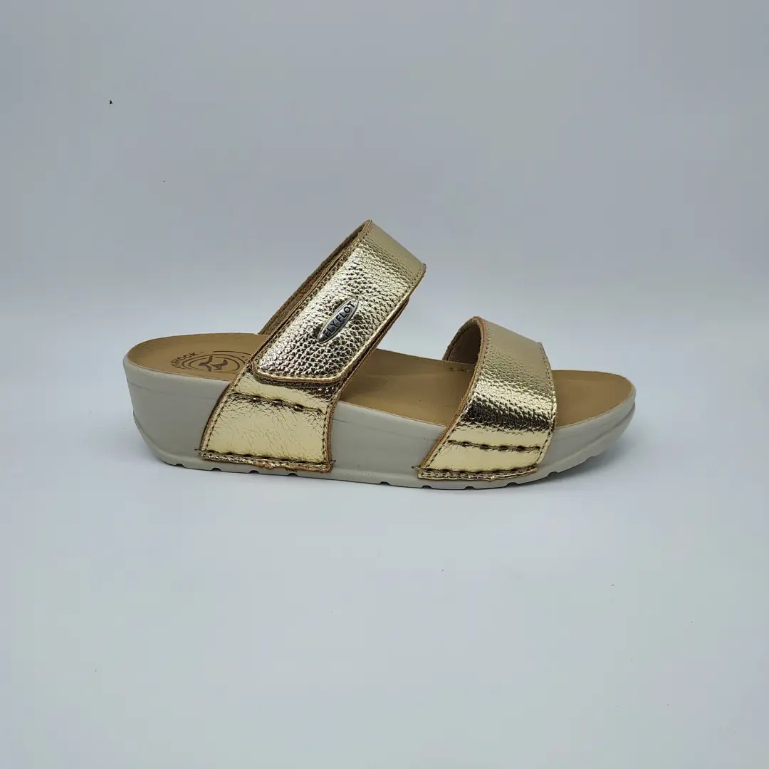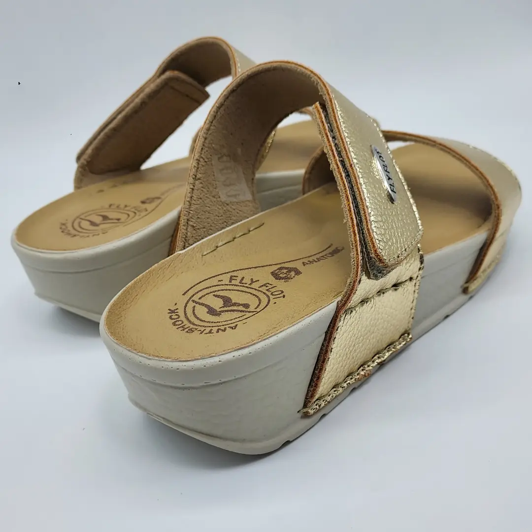 Fly Flot Mod. 38F98-4B, Sandalia en material sintético, acabado Gold, Plantilla Acolchada Antigolpes, Forro Transpirable Airflot, Cierre regulable mediante Velcro. Cuña de 4,6 cm. de altura, Suela de Poliuretano Piumatec.