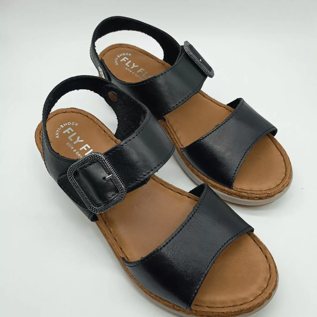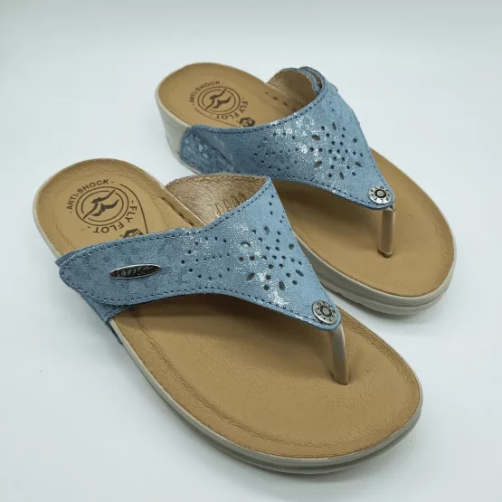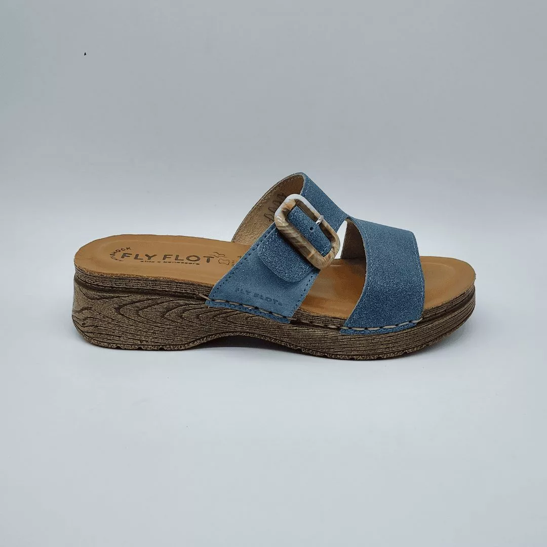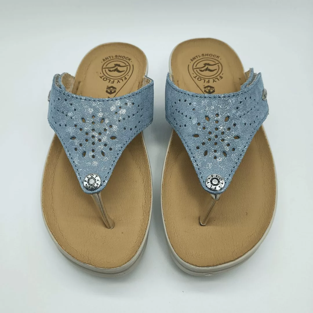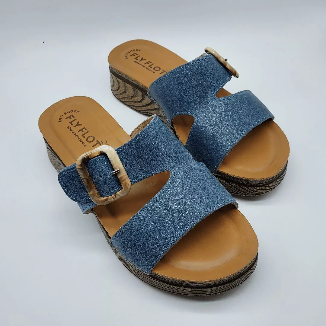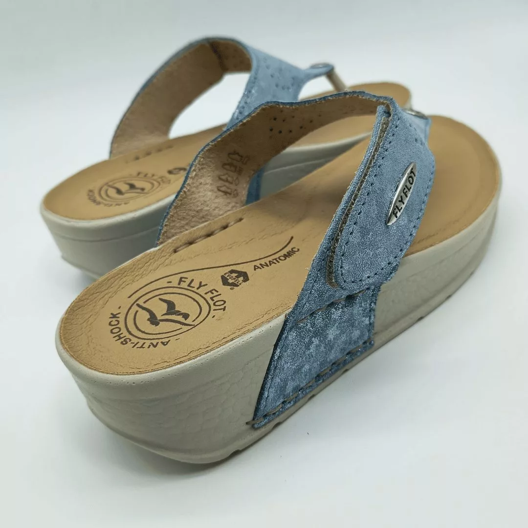 Fly Flot Mod. 38K43-5B, Sandalia en Piel, acabado Light Blue, Plantilla Anatómica y Anti-Shock, Cuña de 4,5 cm. de altura, Cierre mediante Velcro Ajustable. Con detalles de Costura cosidos a mano.