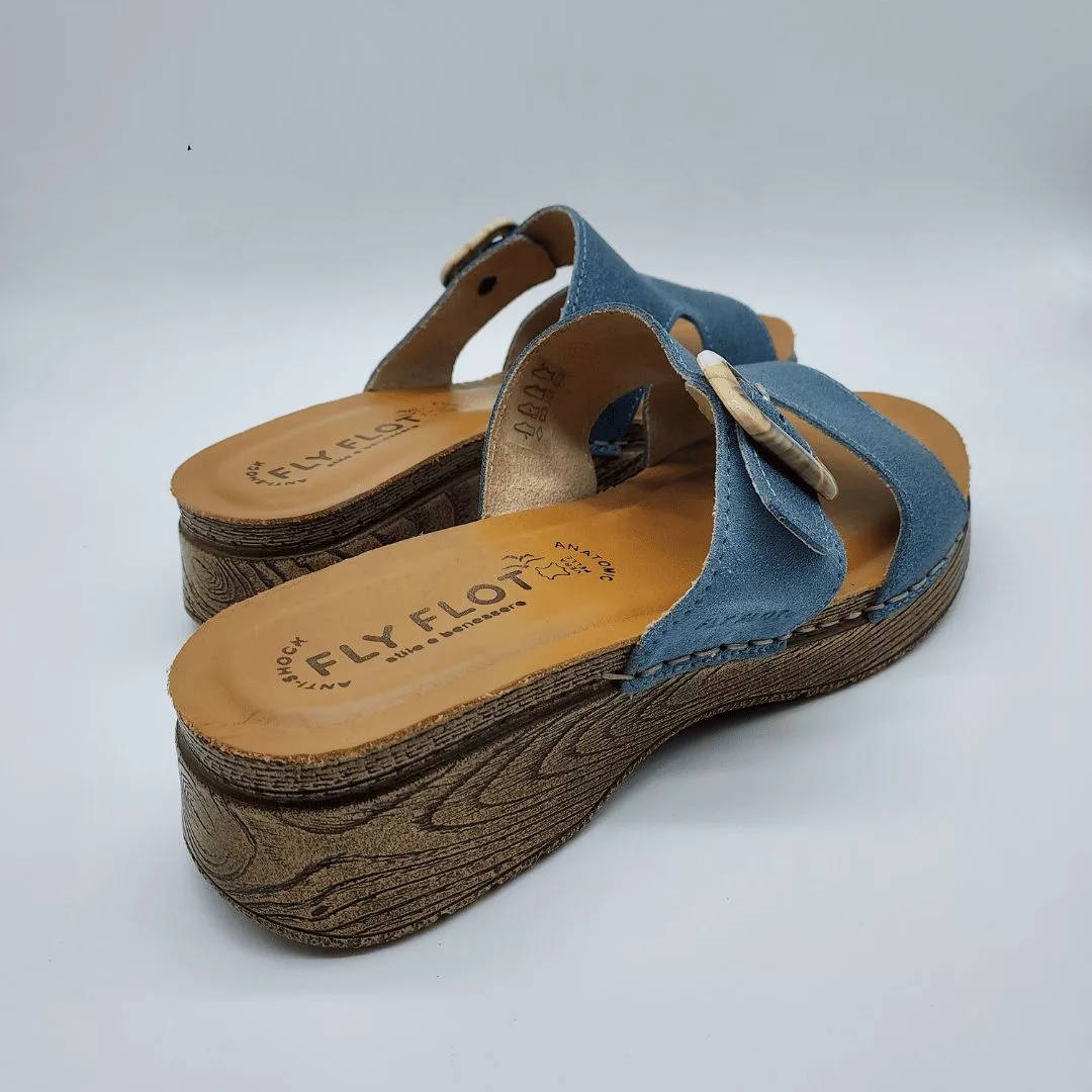 Fly Flot Mod. 72074-EG, Sandalia en Piel acabado Light Blue, Plantilla de Piel Anatómica y Anti-Shock, Cuña de 3 cm. de altura y plataforma de 1,5 cm, Cierre Ajustable mediante Hebilla. Con detalles de Costura cosidos a mano.