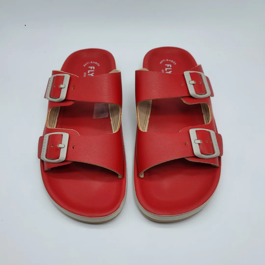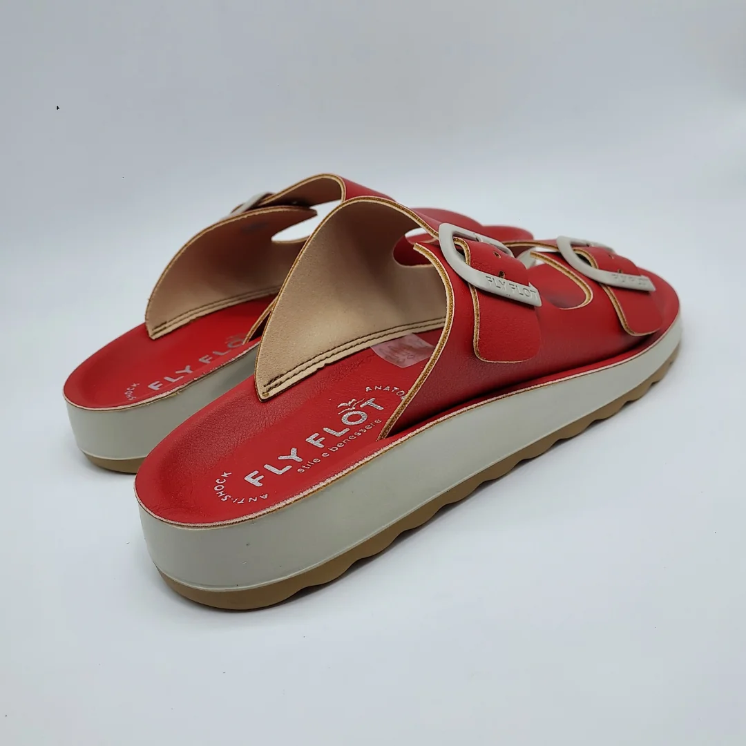 Fly Flot Mod. 77077-ZZ, Sandalia en material sintético, acabado color Red, Plantilla Anatómica, Anti-Shock y Auto-Moldeable, Cuña de 3 cm. de altura y plataforma de 1,5 cm, Cierre Ajustable mediante Hebillas (2). Suela Antideslizante. Hecha en Italia.