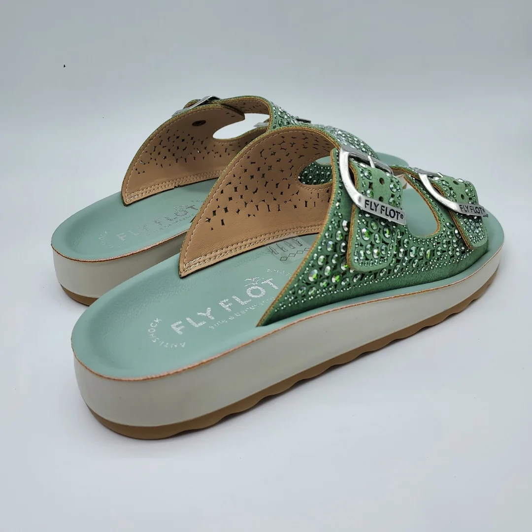 Fly Flot Mod. 77169-KZ, Sandalia en material sintético de fantasía, acabado Water Green, Plantilla Anatómica, Anti-Shock y Auto-Moldeable, Cuña de 3 cm. de altura y plataforma de 1,5 cm, Cierre Ajustable mediante Hebillas (2). Suela Antideslizante. Hecha en Italia.