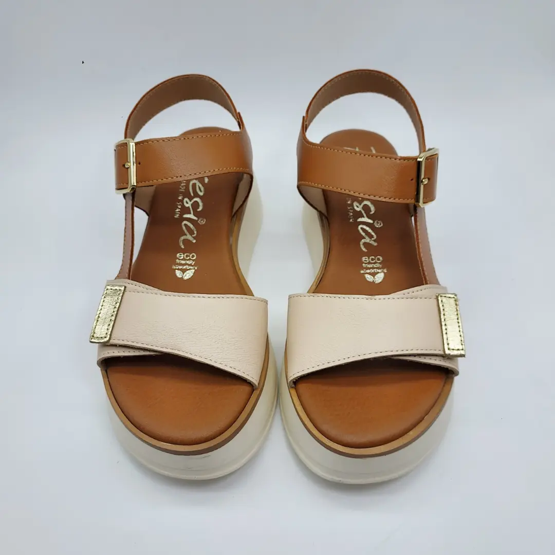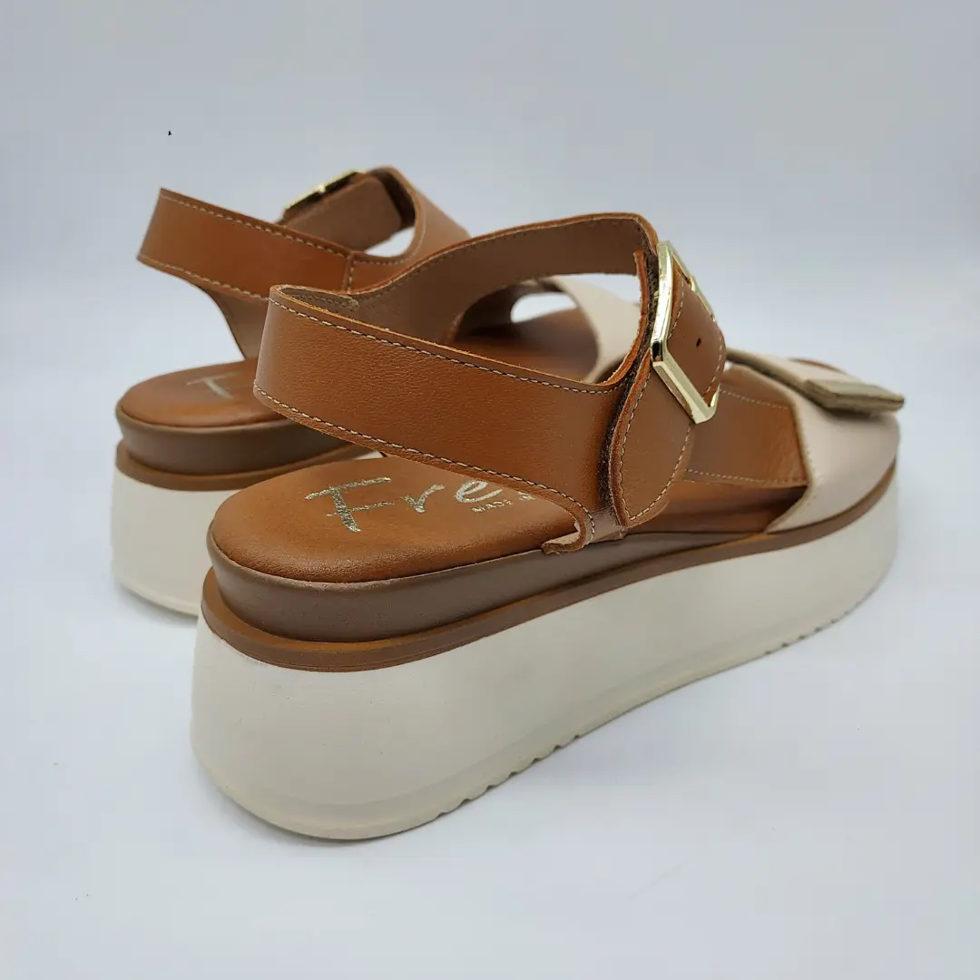 Fresia Mod. 528, Sandalia en Piel lisa acabado color Cuero combinado con Beige, Cuña de 4,5 cm de altura y Plataforma delantera de 2,5 cm, con Plantilla Eco Friendly Vegana, Cierre mediante Velcro Ancho (2) y adorno de Hebilla. Hecha en España.