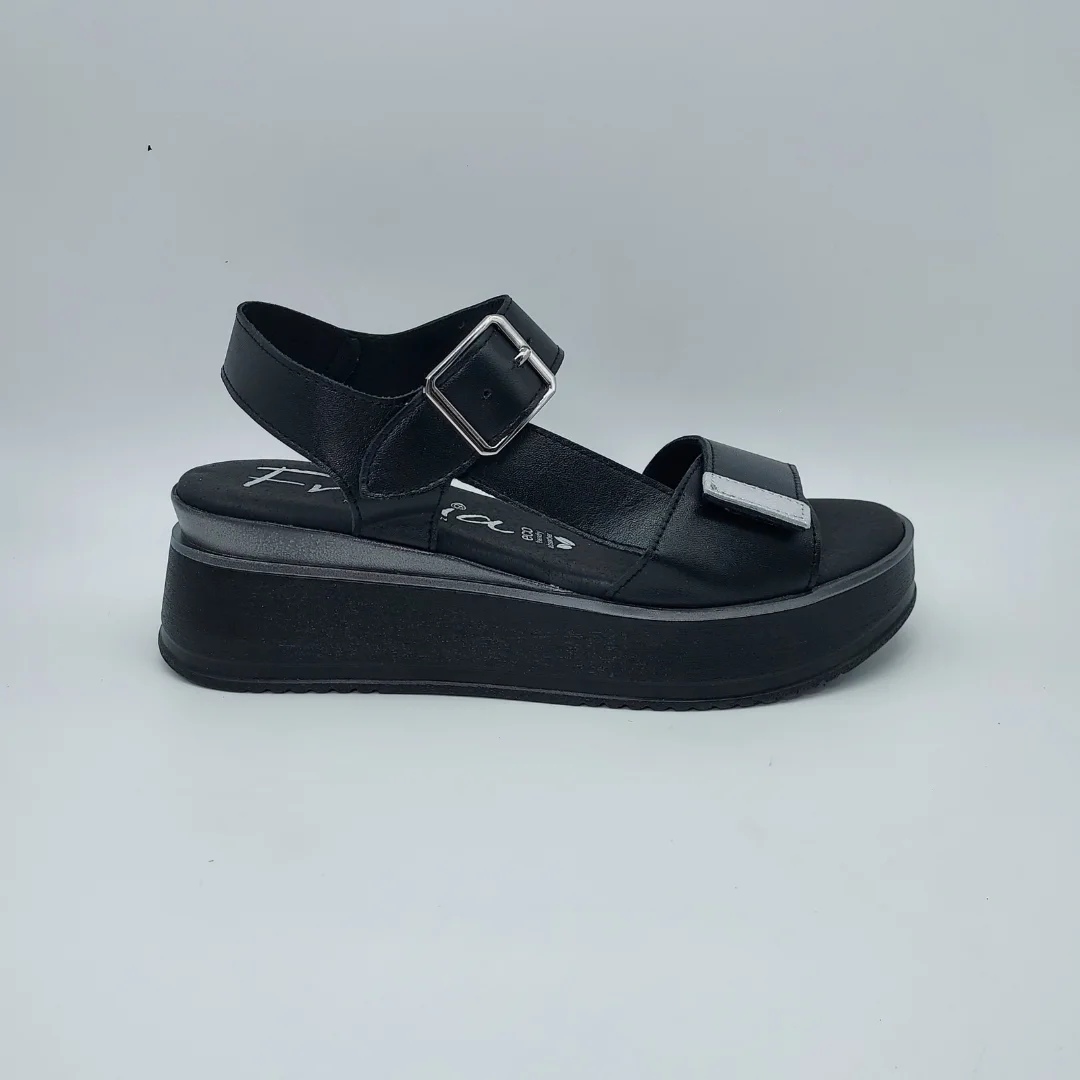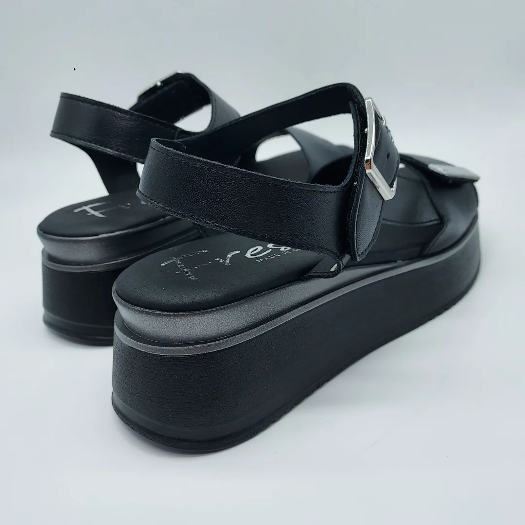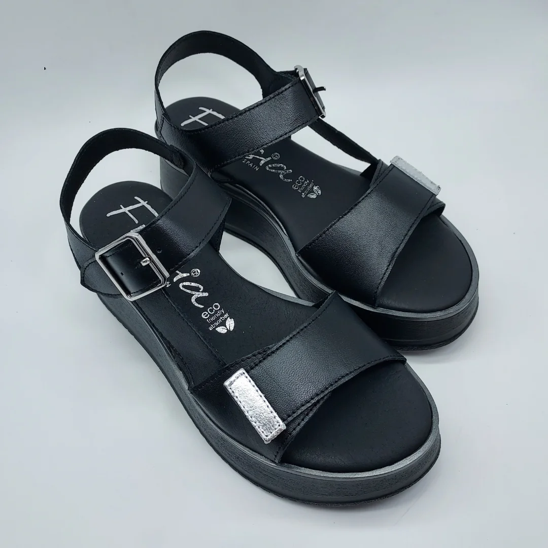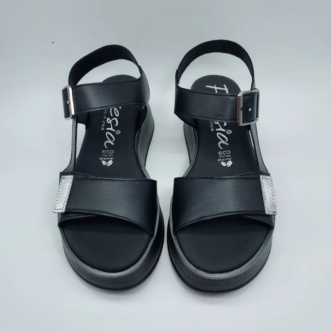 Fresia Mod. 528, Sandalia en Piel lisa acabado color Negro con detalles en Plata, Cuña de 4,5 cm de altura y Plataforma delantera de 2,5 cm, con Plantilla Eco Friendly Vegana, Cierre mediante Velcro Ancho (2) y adorno de Hebilla. Hecha en España.