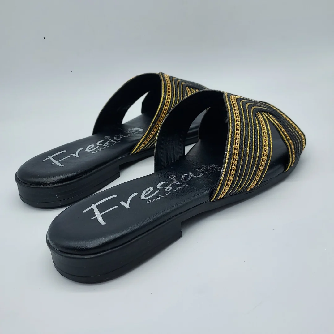 Fresia Mod. 582, Sandalia en Textil acabado color Negro con detalles en Dorado, Tacón Bajo de 1,5 cm de altura, con Plantilla Eco Friendly Absorbente. Hecha en España. Envío, Devolución y Reembolso