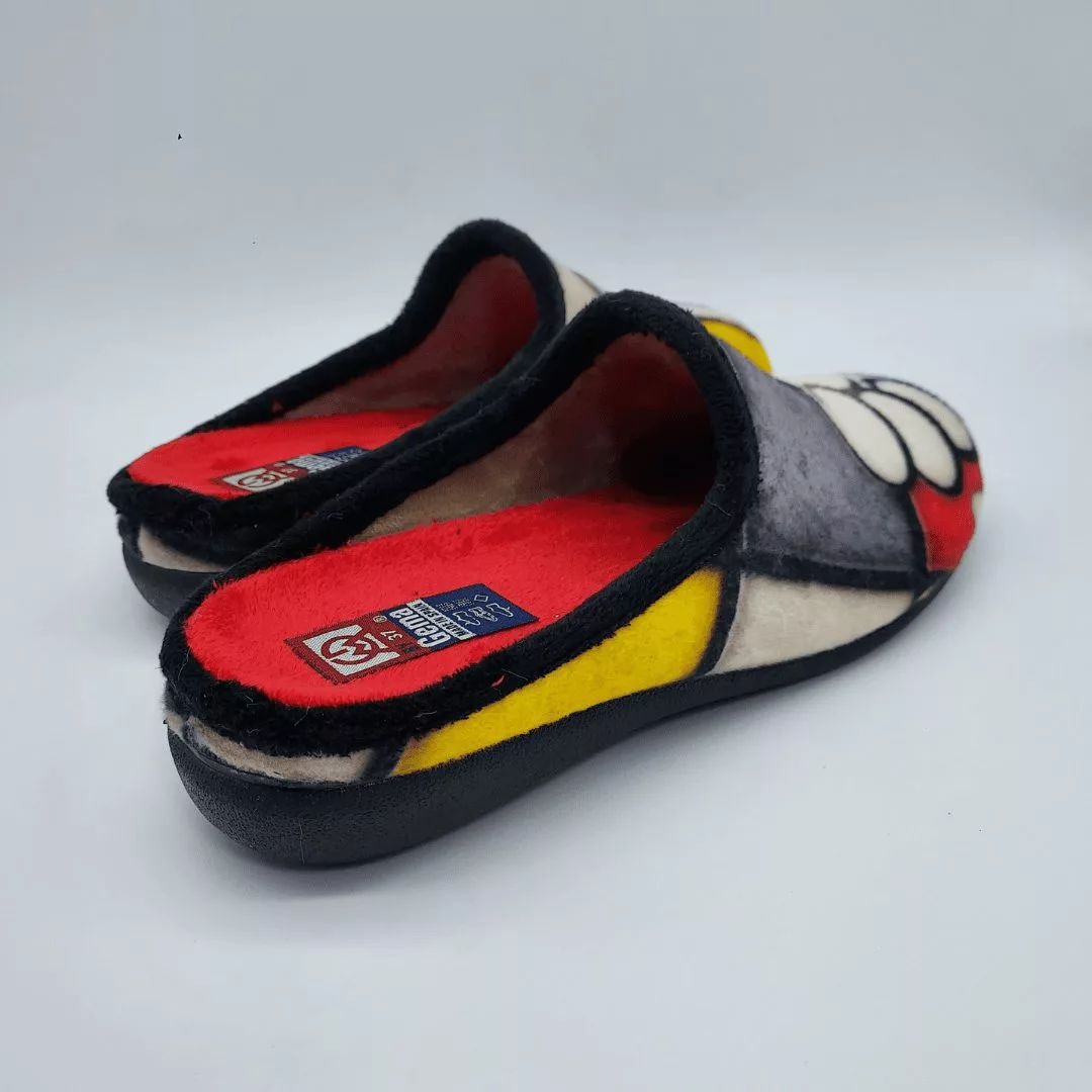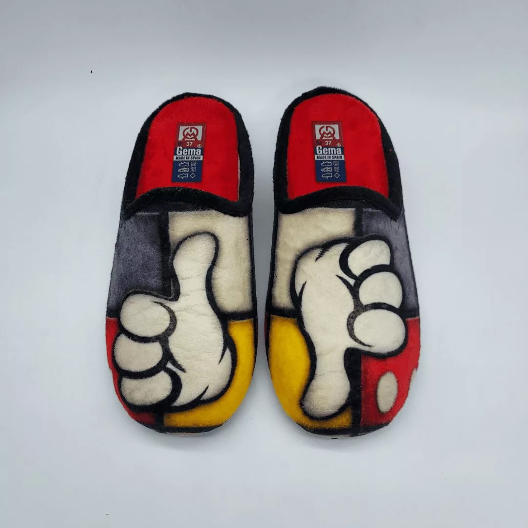 Gema García Mod. 7000-11, Zapatilla Plana Abierta acabado color Negro con estampado «Mano Mouse», Forro Interior Suave, Ribete de Pelo y Plantilla Acolchada Extraible. Suela de Caucho. Hechas en España.