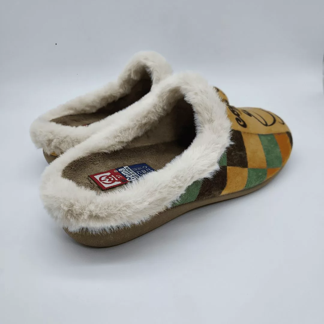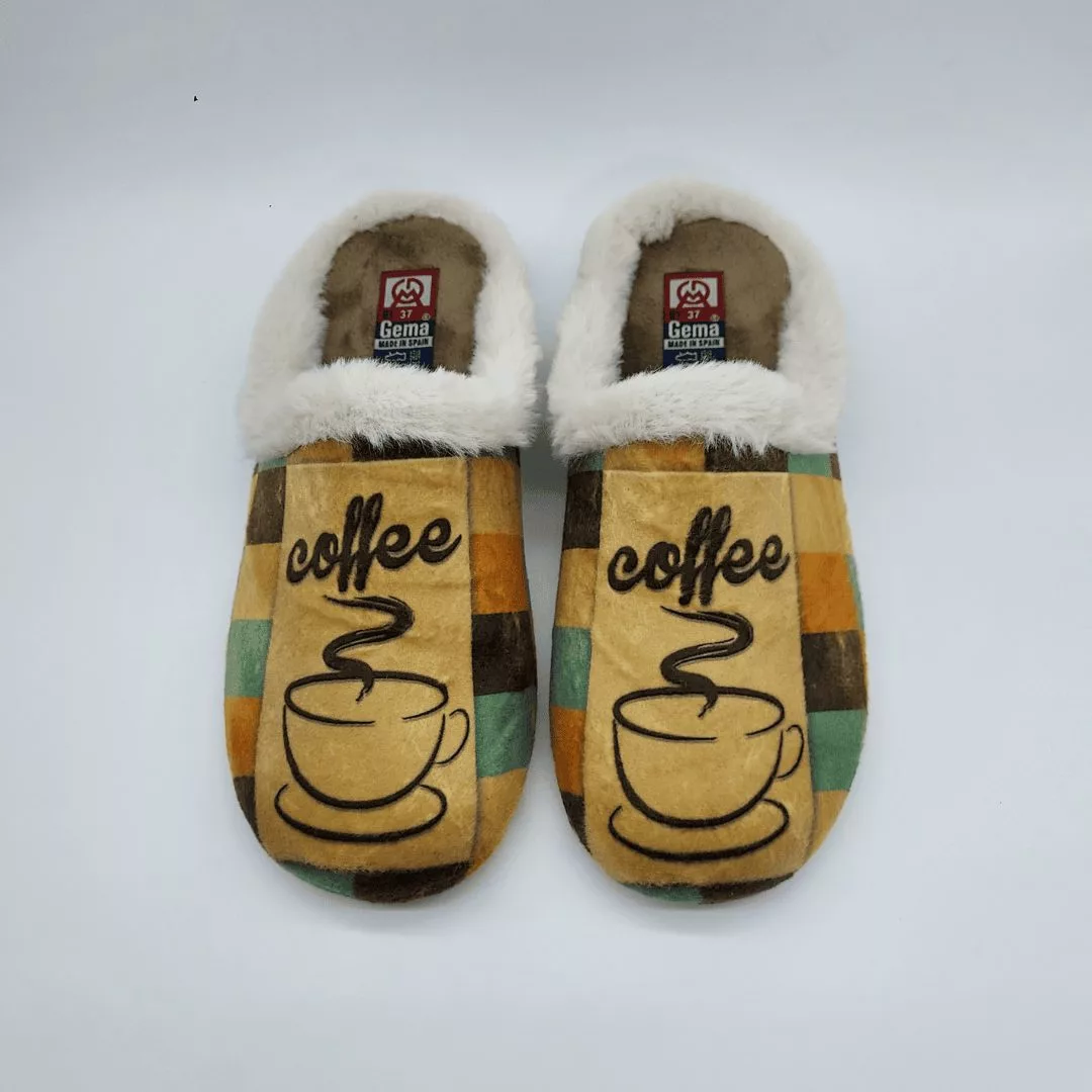 Gema García Mod. 7000-6, Zapatilla Plana Abierta acabado color Taupe con estampado «Hot Coffee», Forro Interior Suave, Ribete de Pelo y Plantilla Acolchada Extraible. Suela de Caucho. Hechas en España.